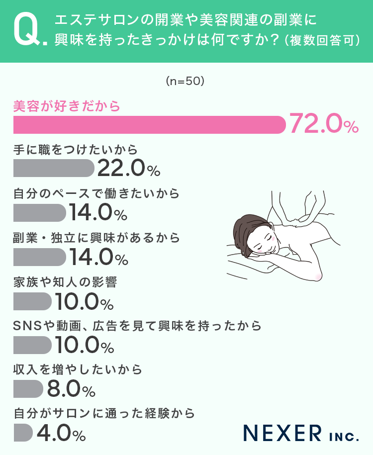 ■72.0%が「美容が好きだから」エステサロンの開業や美容副業に興味を持ったと回答