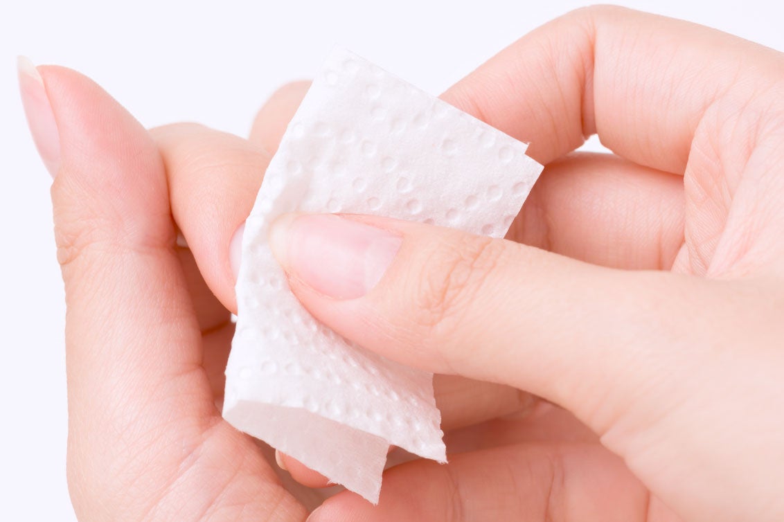 ネイルクリーナーやエタノールで爪の表面をふき取ります。エタノールをお持ちでない場合は、ハンドソープで爪を丁寧に洗って油分を取り除いてください。