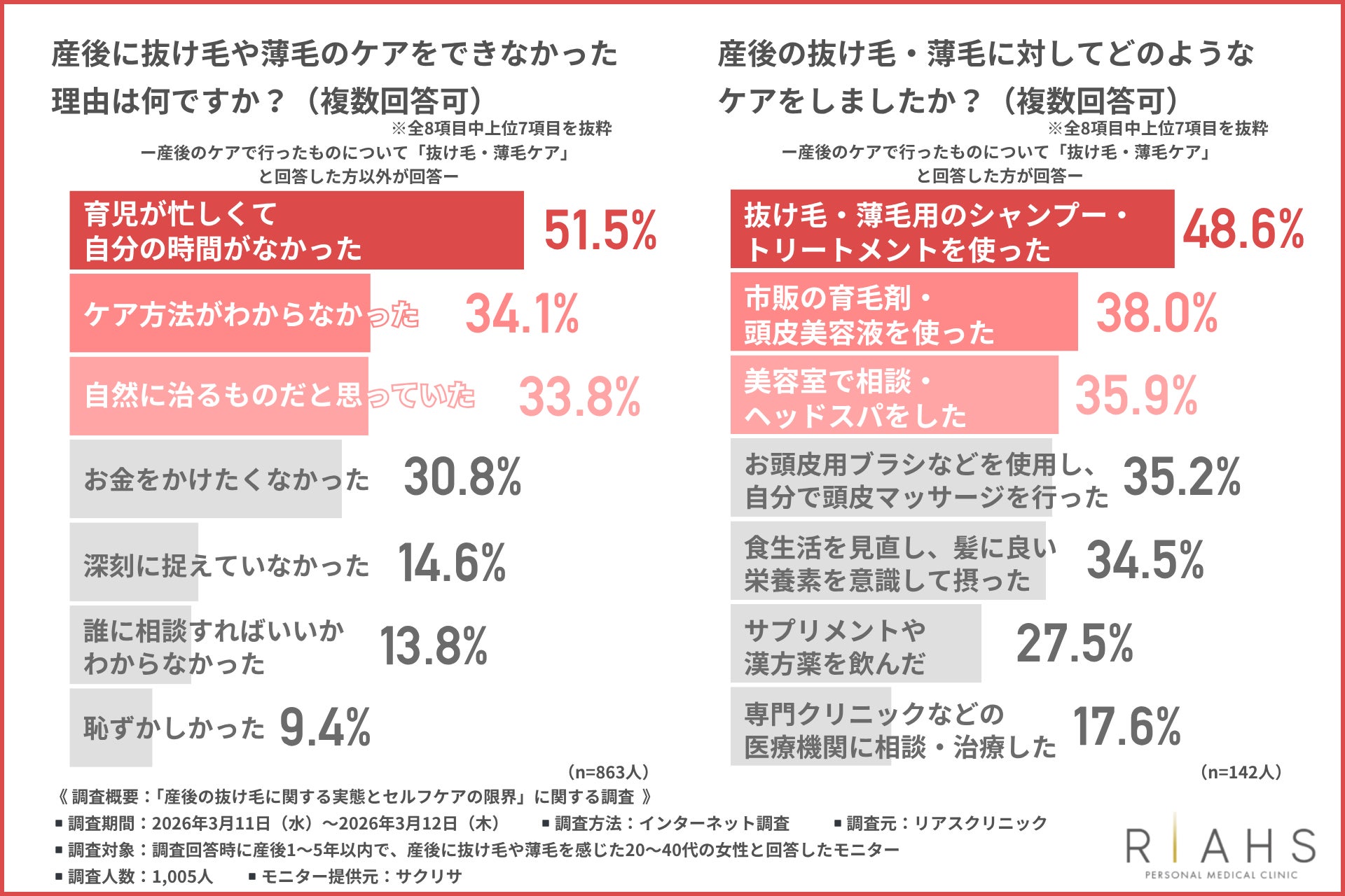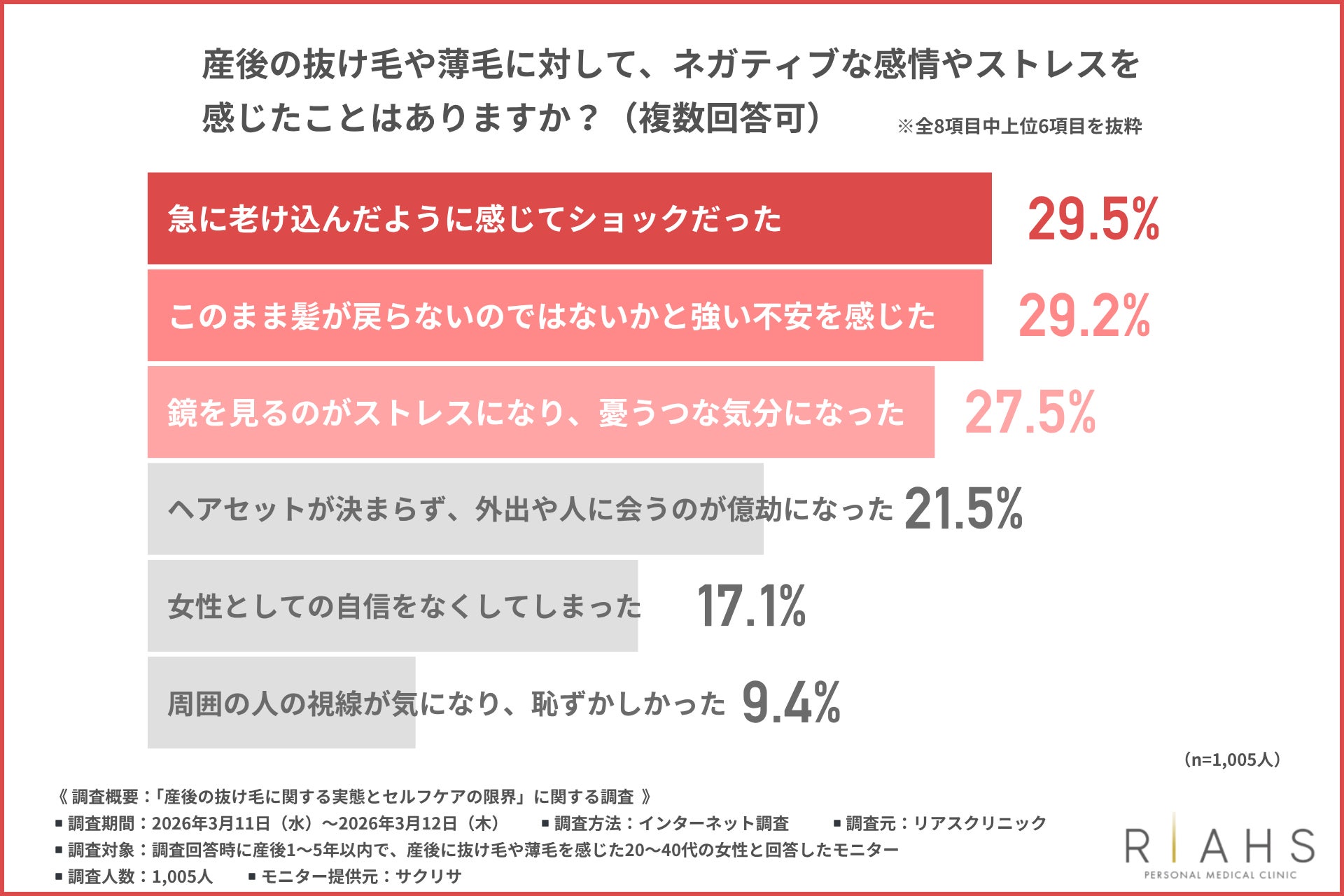 そこで今回、リアスクリニック(https://riahsclinic.com/)は、産後1~5年以内で、産後に抜け毛や薄毛を感じた20~40代の女性を対象に「産後の抜け毛に関する実態とセルフケアの限界」に関する調査を行いました。