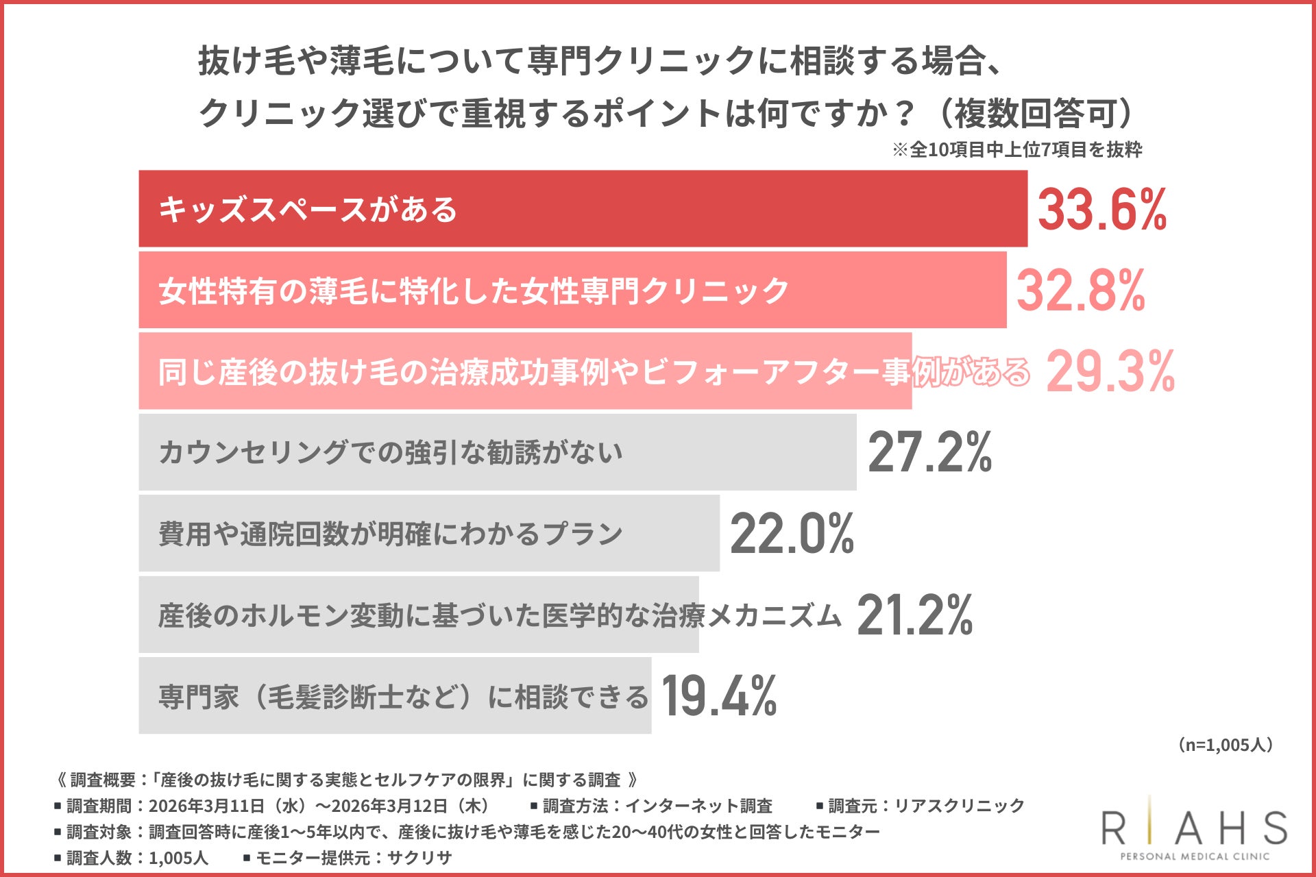 「抜け毛や薄毛について専門クリニックに相談する場合、クリニック選びで重視するポイント」について尋ねたところ、『キッズスペースがある(33.6%)』が最も多く、『女性特有の薄毛に特化した女性専門クリニック(32.8%)』『同じ産後の抜け毛の治療成功事例やビフォーアフター事例がある(29.3%)』と続きました。