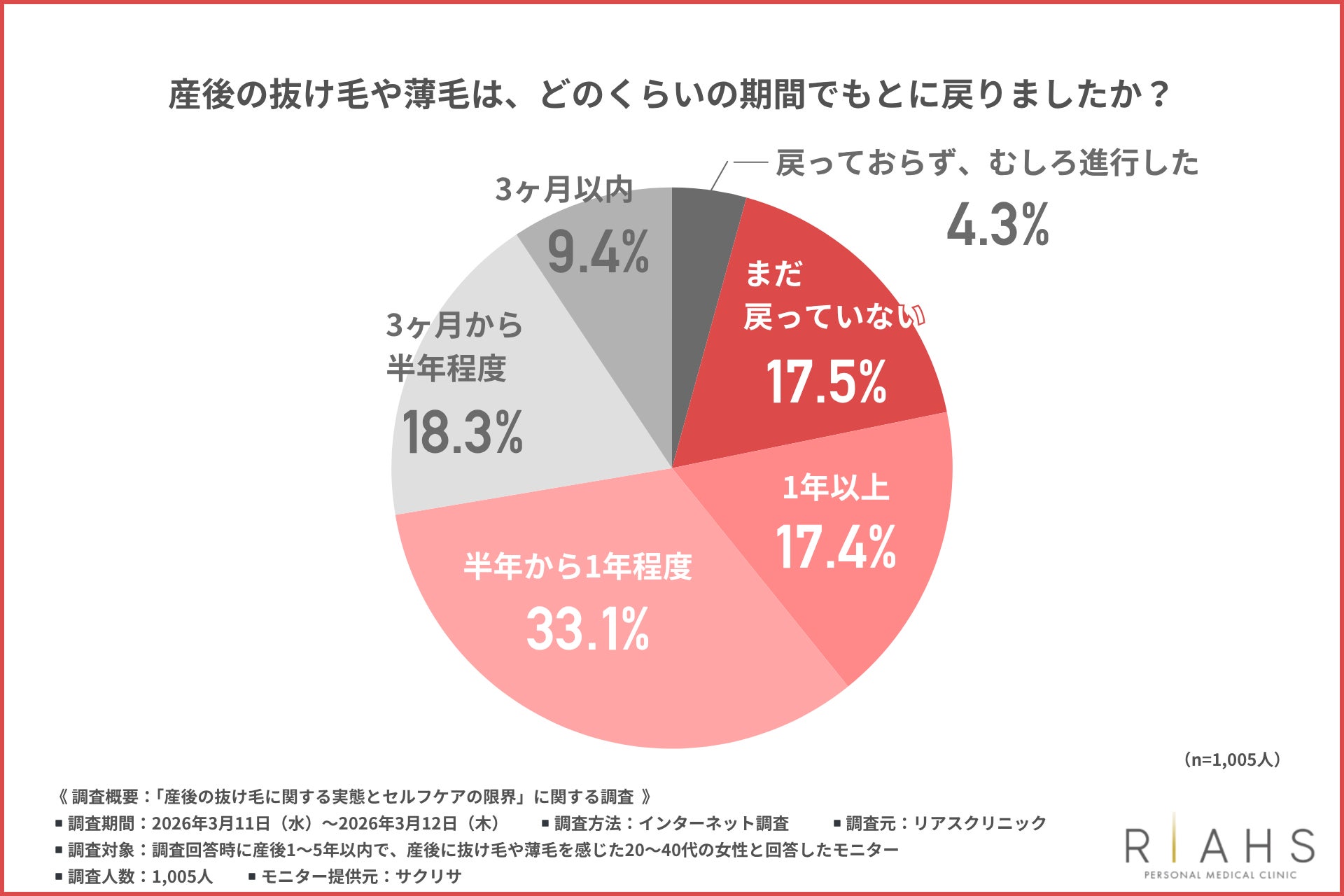 リアスクリニック(所在地:東京都中央区)は、産後1〜5年以内で、産後に抜け毛や薄毛を感じた20〜40代の女性を対象に「産後の抜け毛に関する実態とセルフケアの限界」に関する調査を行いました。