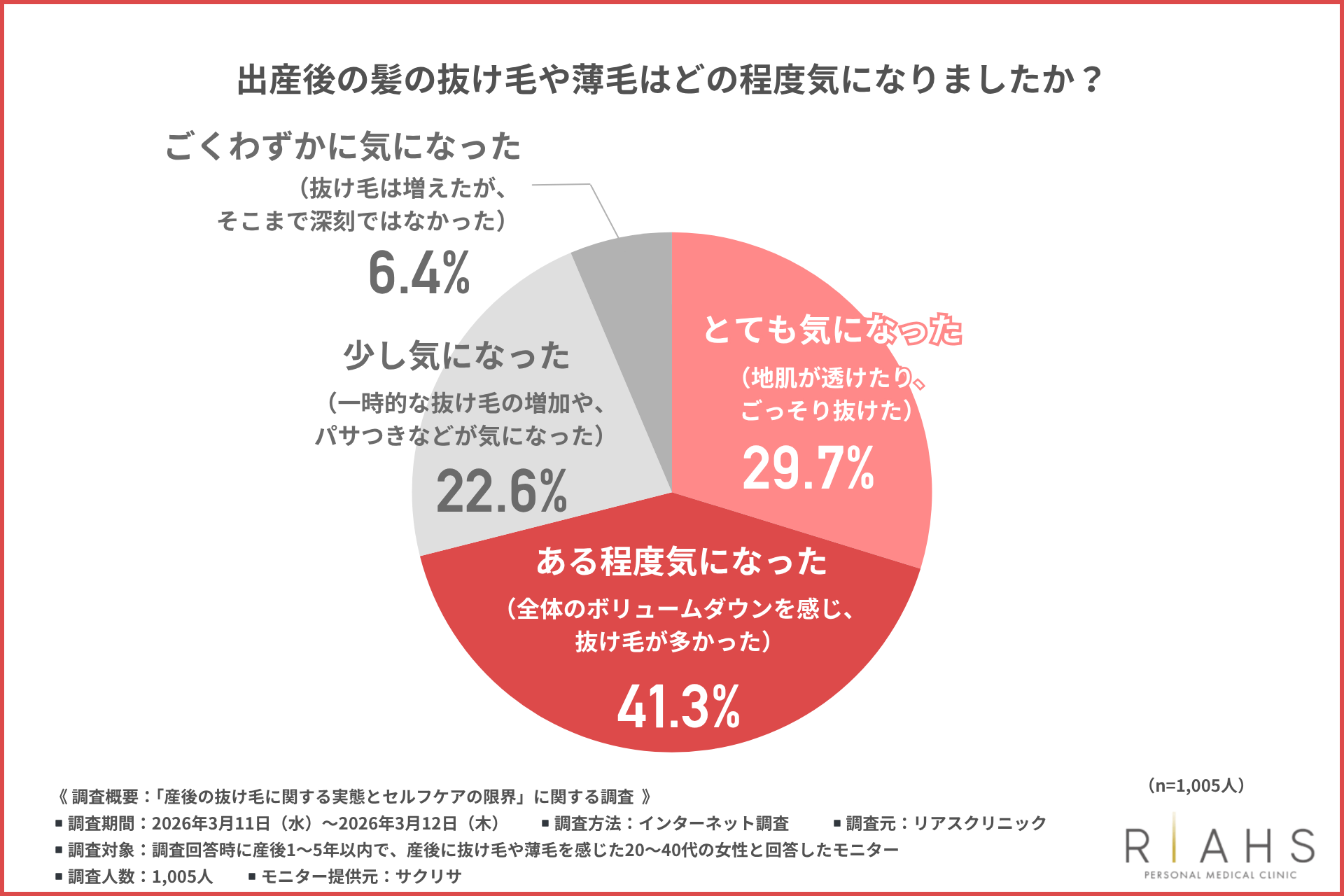 そこで今回、リアスクリニック(https://riahsclinic.com/)は、産後1~5年以内で、産後に抜け毛や薄毛を感じた20~40代の女性を対象に「産後の抜け毛に関する実態とセルフケアの限界」に関する調査を行いました。