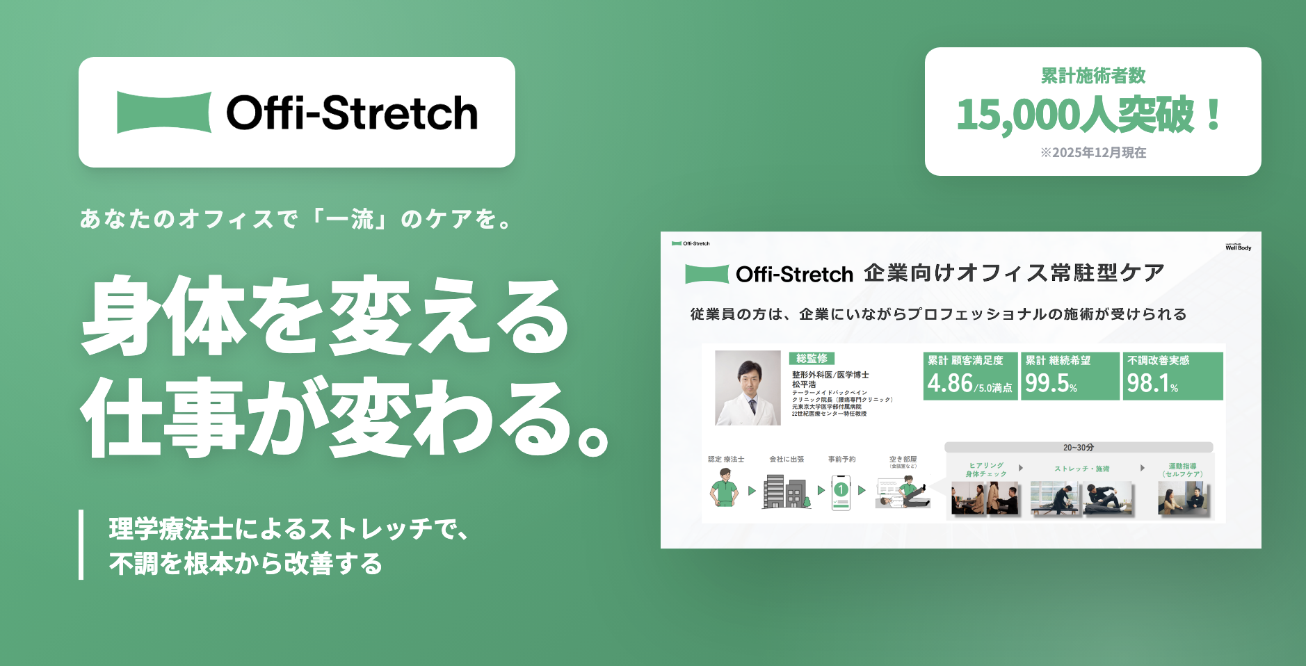 理学療法士として2万人を診た経験から「身体が良くなる概念、メカニズム」を発見した代表取締役の水野純一。独自メソッドを体現した中野の店舗は、口コミで広がり、トップアスリートや上場企業経営者、ビジネスパーソンから信頼を得ました。このメソッドをさらに広めるため2022年創業。「常識を変え、身体を変え、人生を豊かに。」を掲げ、現在は整形外科医の松平浩氏も顧問に就任し、独自メソッドを企業に出張して働く方にお届けするという、理学療法士の出張施術サービス「Offi-Stretch®」を展開しています。