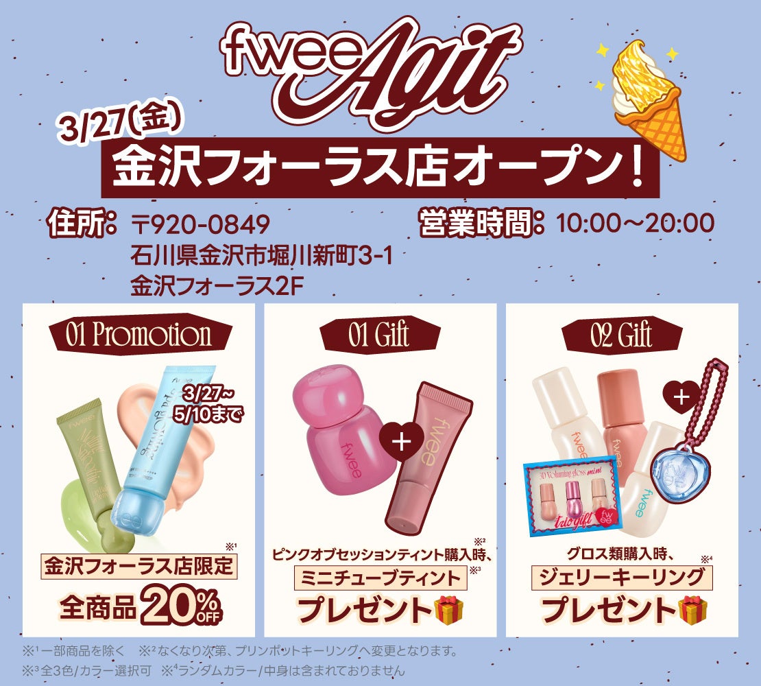 株式会社BENOW JAPAN(日本支社所在地:東京都新宿区、代表取締役:金大栄)が展開するコスメブランド「fwee(フィー)」は、 2026年3月27日(金)に日本8店舗目となるフラッグシップストア「フィーアジト 金沢フォーラス」を、また2026年4月3日(金)に9店舗目となる「フィーアジト イオンモール岡山」を新たにオープンいたします。
