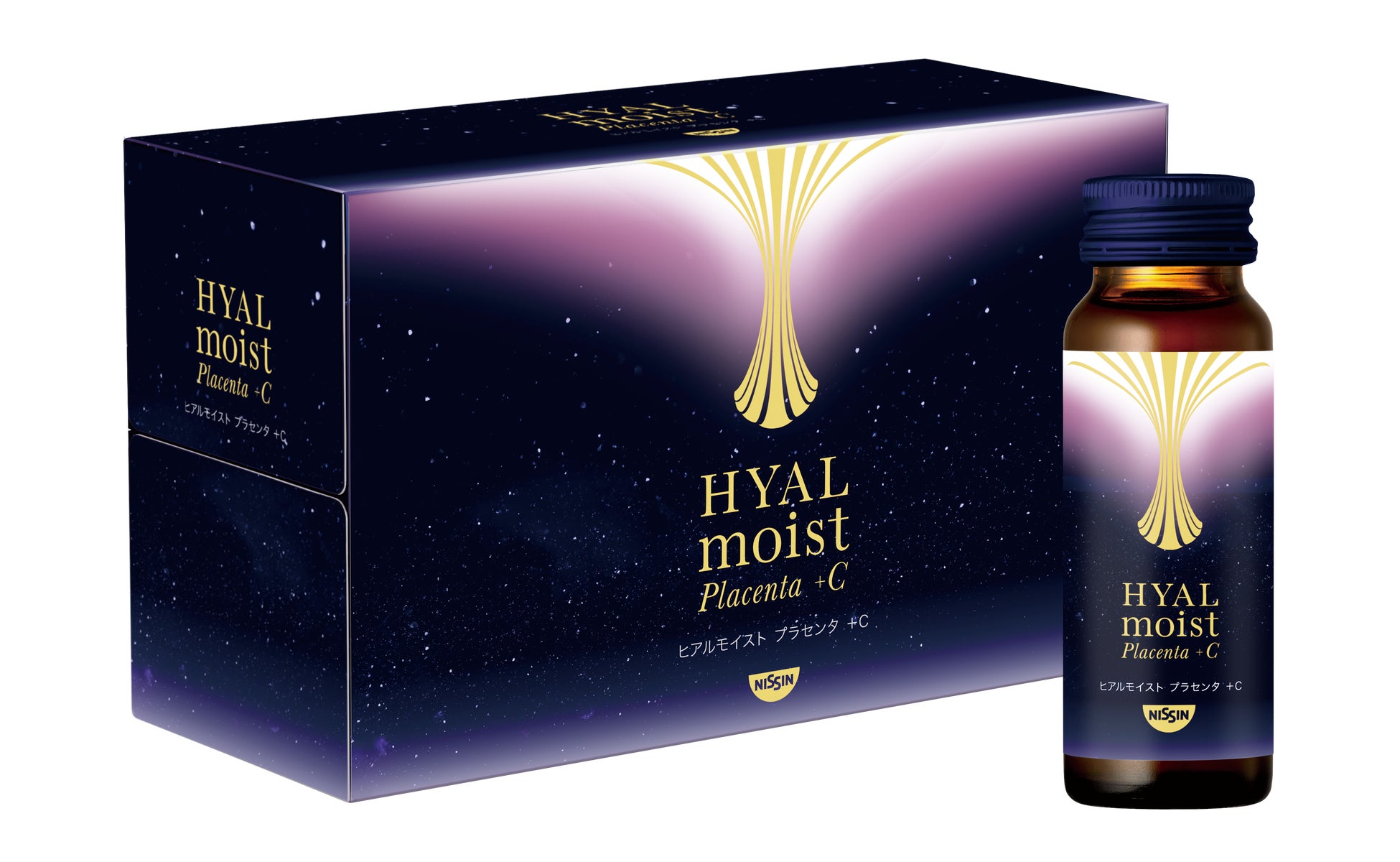 からだの中のヒアルロン酸に着目した日清食品グループ独自の「ヒアルモイスト乳酸菌」をはじめ、コラーゲン、プラセンタ、ビタミンCを配合した美容ドリンク。1本 (50ml) の中にヒアルモイスト乳酸菌液を20,000mg、ヒアルモイスト乳酸菌末を22mg、コラーゲンを5,000mg、プラセンタエキス末を200mg、ビタミンCを500mg配合しています。従来品と比べてヒアルモイスト乳酸菌末の量を10%アップし、さらにプラセンタ特有の苦みやエグみを抑えることで、毎日続けやすいコクのある甘さのマスカット味に生まれ変わりました。複数の美容成分をまとめて摂取できるドリンクタイプで、日々のうるおいや明るさに加えて、ハリのある毎日をサポートします。1本あたり29kcalです。