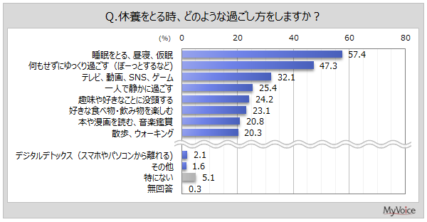 休養時の過ごし方は(複数回答)、「睡眠をとる、昼寝、仮眠」が57.4%、「何もせずにゆっくり過ごす」が47.3%、「テレビ、動画、SNS、ゲーム」が32.1%です。