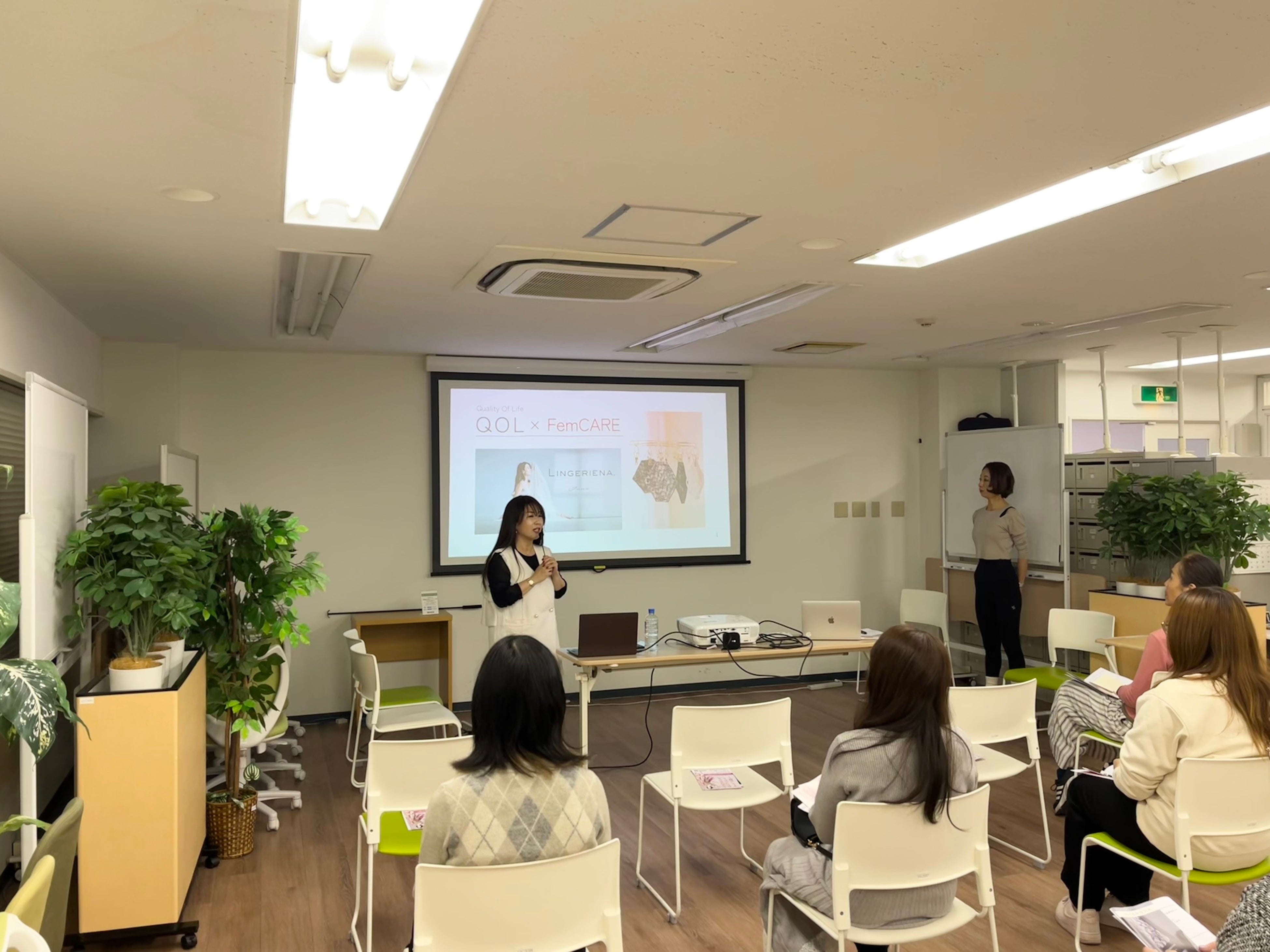 JUNA株式会社 代表取締役 安藤淳子氏からは、女性のQOL向上のためのフェムケア知識について紹介があり、「自分の体に目を向け、必要なフェムケアアイテムを取り入れていくことで、より心地よく日常を過ごすことができる」といったメッセージが伝えられました。また、自身の体験談を交えた説明により、LINGERIENAの機能性にも関心が集まりました。