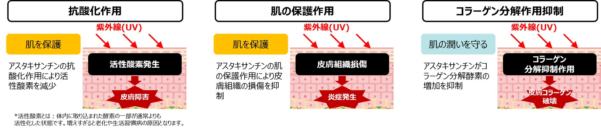 アスタキサンチンには、肌に大きなダメージをもたらす紫外線(UV)により発生した活性酸素*を減少させ、皮膚の損傷を抑制し、肌を保護し、またコラーゲン分解酵素の増加を抑えることで、肌の潤いを守ることが、研究レビューの論文からも評価されています。