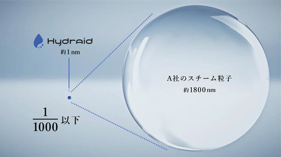 2 スチーム粒子:2016年当時国内市場で販売されていた他社スチーマーA 粒子サイズ:A社スチーム粒子:約1800nm(測定方法:DANTEC社製 位相ドップラ式粒径流速測定装置) 当社粒子:約1nm(測定方法:ワイコフ科学DMAナノ粒子測定装置)*ハイドレイドは位相ドップラ式粒径流速測定装置では微小なため検出できず。