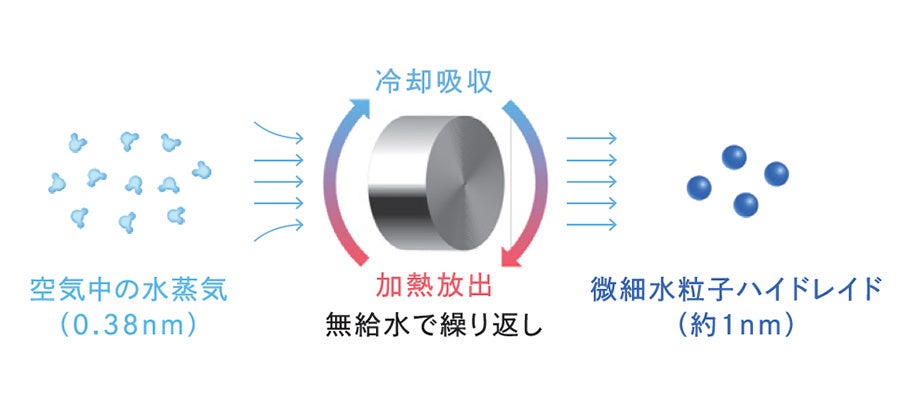 高い吸湿性を持つ素材が空気中の水分子を自発的に集め、ナノレベルの構造を通過させることで水分子を微細化。内部で温められることで押し出すように放出されます。