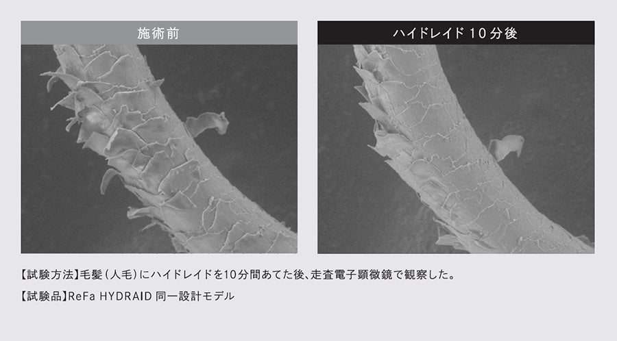 ReFa HYDRAIDから放出された「ハイドレイド」は、キューティクルを広げずに隙間から入り込み、毛髪内部のすみずみまで行き渡ります。そして抜けにくいため毛髪内に定着します。