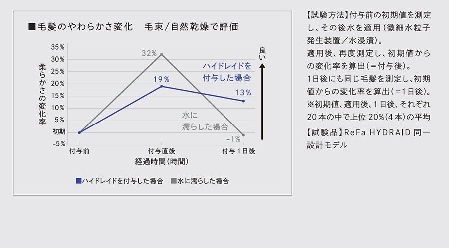 ハイドレイドが浸透・定着することで毛髪内部の水分量が増加。施術工程のどのタイミングで使っても手触りがやわらかくなめらかになり、キューティクルのめくれも整えます。