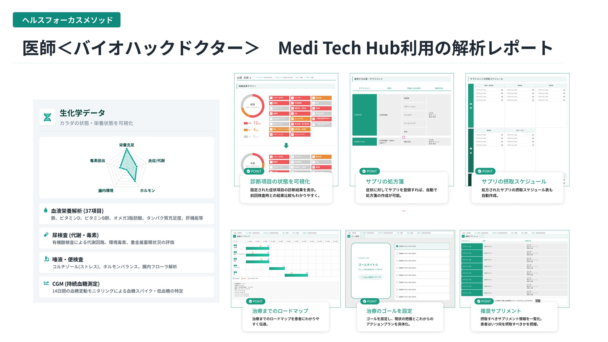 血液・ホルモン・腸内環境などの生化学データを医学的観点から評価し、特許技術を基盤とする「Meditech Hub(メディテックハブ)」を活用した評価・支援体制を紹介