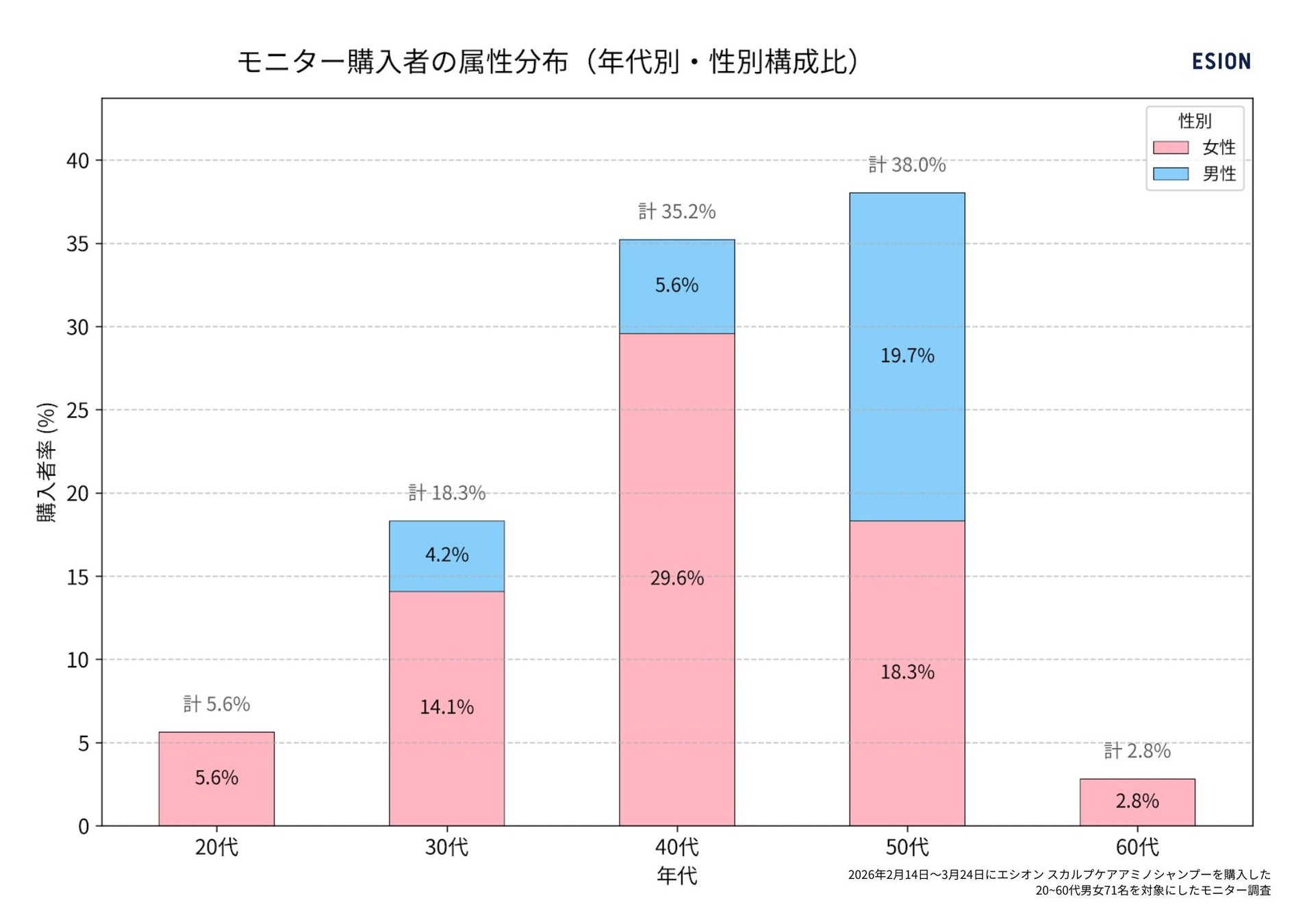 株式会社エシオン(本社:神奈川県藤沢市、代表取締役:吉田圭太)は、2026年2月14日~3月24日に『エシオン スカルプケア アミノシャンプー(完全無香料)』を購入した20~60代の男女71名を対象にモニターへアンケートを実施。