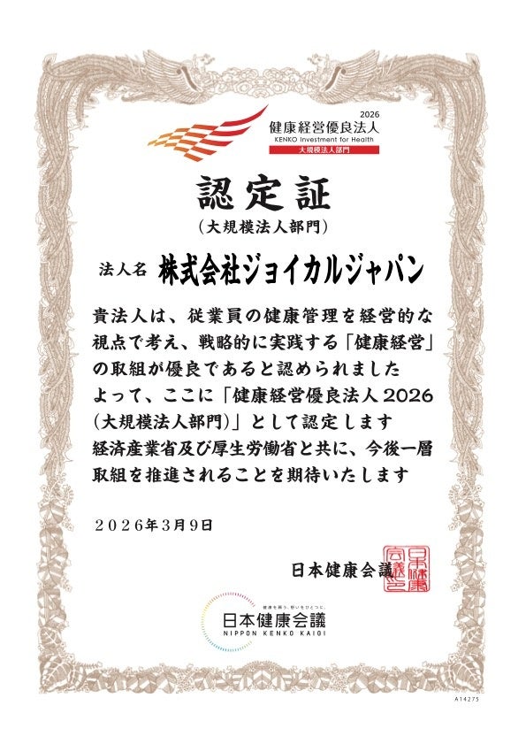 株式会社ジョイカルジャパン(本社:東京都千代田区/代表取締役社長 CEO 早川 由紀夫、以下:ジョイカルジャパン)は、2026年3月9日付で、経済産業省および厚生労働省、日本健康会議が選定する「健康経営優良法人2026(大規模法人部門)」に3年連続で認定されましたことをお知らせします。