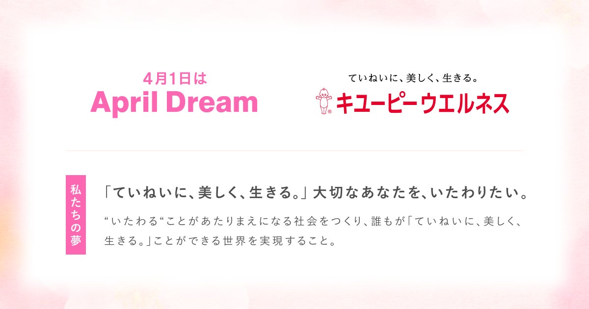 このプレスリリースは、「株式会社トウ・キユーピー」の夢です。当社が展開する「キユーピーウエルネス」のブランド思想および取り組みに基づき、想いを込めてApril Dreamに参加します。