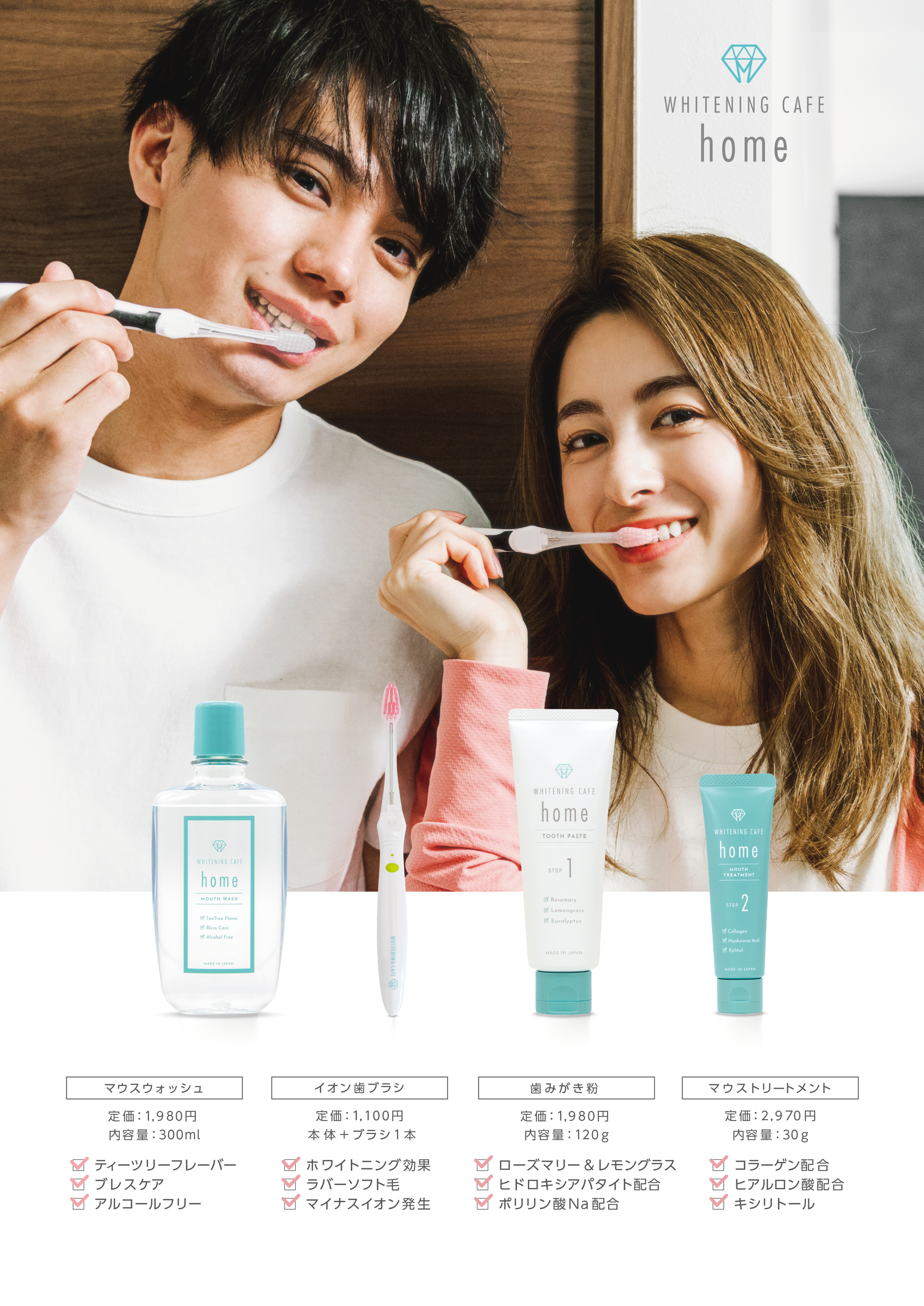 ホワイトニングカフェでは独自開発の歯磨き粉、トリートメント、マウスウオッシュや歯ブラシ、たばこのヤニ用の歯磨き粉や歯の汚れを落すキュキュ(スポンジ)などの商品を取り揃えております。これらを使うことで歯を継続的に白く保つお手伝いが可能です。