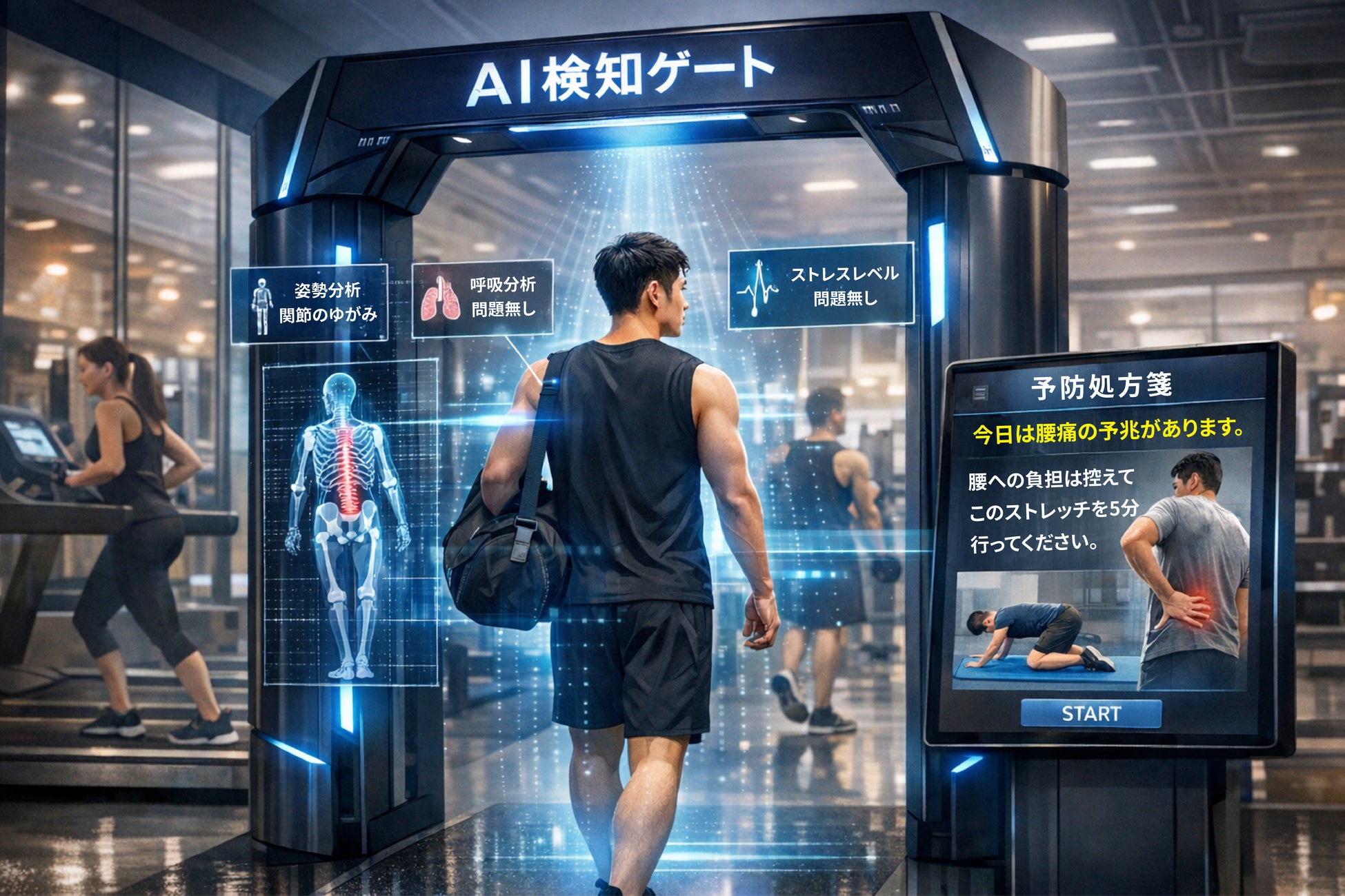 会員様がゲートを通るわずか0.5秒の間に、歩行姿勢から関節のゆがみを、呼気から内臓の異常兆候を、心拍変動からストレスレベルを検知。