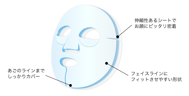 伸縮性が高く、より密着感を高めるための4つのカットラインがあるシートを採用。あごの部分で支え、ぐっと引き上げながら密着させることで、ぎゅっと引き締まった印象へと導きます。
