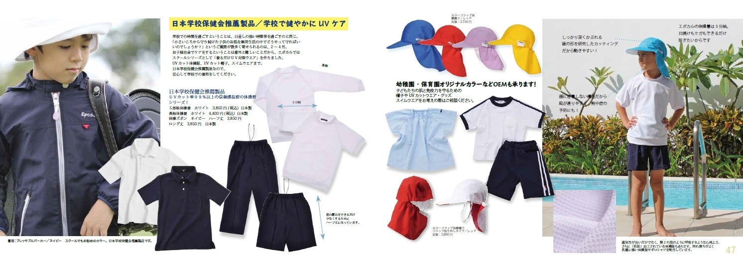 エポカルブランドが最初に向き合ったのは、幼稚園・保育園での集団生活における紫外線対策でした。外遊びの多い幼児期こそ、肌へのダメージが蓄積しやすい時期です。園や先生方と連携しながら、UVカット通園帽子、UVカットフラップ体操帽子(たれ付き)、UVカット体操服・制服を開発・提供し、子どもたちの健やかな成長を見守り続けてきました。全国約100の園への導入、公益財団法人日本学校保健会の推薦品認定は、その積み重ねの証です。