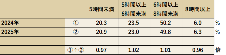 現在、日本人の20.9%が睡眠時間5時間未満という、危機的な「短時間睡眠」の状態にあります。2024年と比較しても、5時間未満の割合は微増しており、日本全体の睡眠不足は解消されるどころか、深刻化の兆しを見せています。