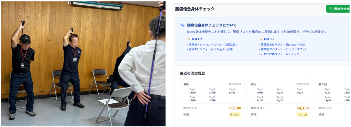 一人ひとりの柔軟性や動作の癖をプロが直接確認し、将来の不調に繋がる「腰痛借金」のレベルを個別に判定