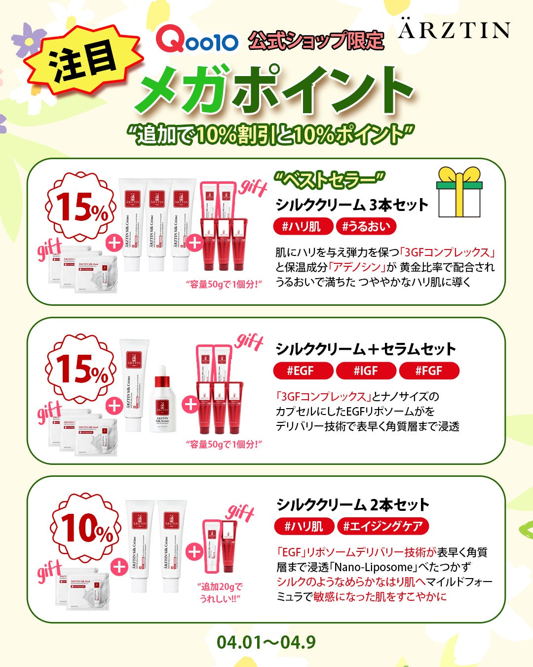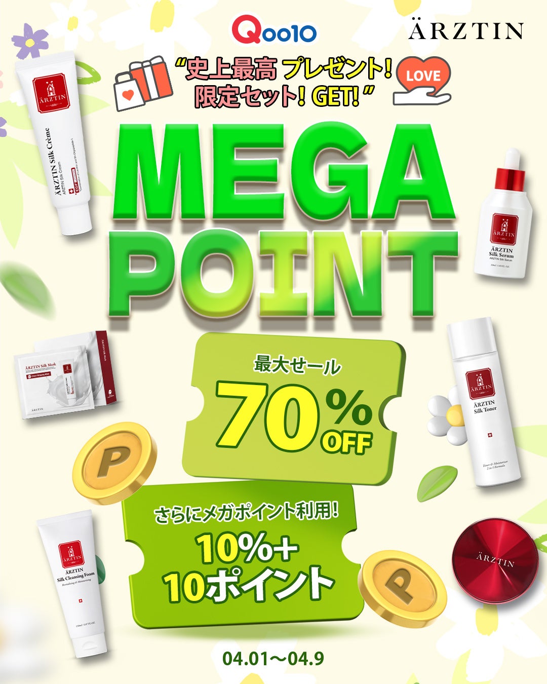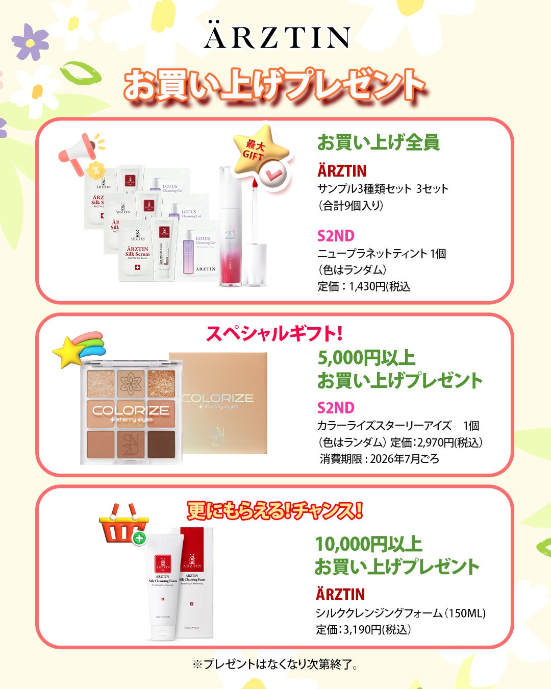 今回のエルツティンQoo10公式ショップのメガポイントでは、最大70%OFFとお買い上げの方全員にはARZTINサンプル3種1個セットを3個(合計9個)をプレゼントとS2NDの「ニュープラネットティント(色はランダム) 1個」1,430円相当 、5,000円以上は「カラーライズスターリーアイズ(色はランダム) 1個」2,970円相当 、10,000円以上は「シルククレンジングフォーム(150ML)3,190円相当1個」をプレゼント。 以前よりお得なクーポンも700円クーポン、500円クーポン、200円クーポン、100円クーポン様々なクーポンを発行して10,000円以上は送料が無料のチャンスがありますのでぜひ、楽しんで下さい。