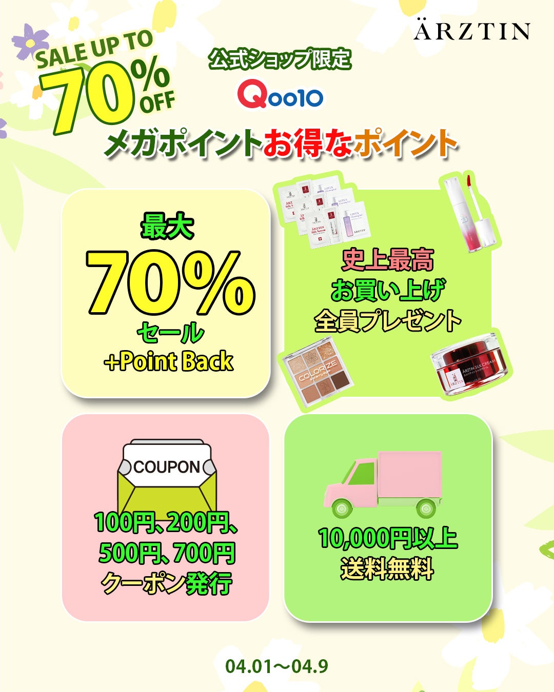 今回のエルツティンQoo10公式ショップのメガポイントでは、最大70%OFFとお買い上げの方全員にはARZTINサンプル3種1個セットを3個(合計9個)をプレゼントとS2NDの「ニュープラネットティント(色はランダム) 1個」1,430円相当 、5,000円以上は「カラーライズスターリーアイズ(色はランダム) 1個」2,970円相当 、10,000円以上は「シルククレンジングフォーム(150ML)3,190円相当1個」をプレゼント。 以前よりお得なクーポンも700円クーポン、500円クーポン、200円クーポン、100円クーポン様々なクーポンを発行して10,000円以上は送料が無料のチャンスがありますのでぜひ、楽しんで下さい。
