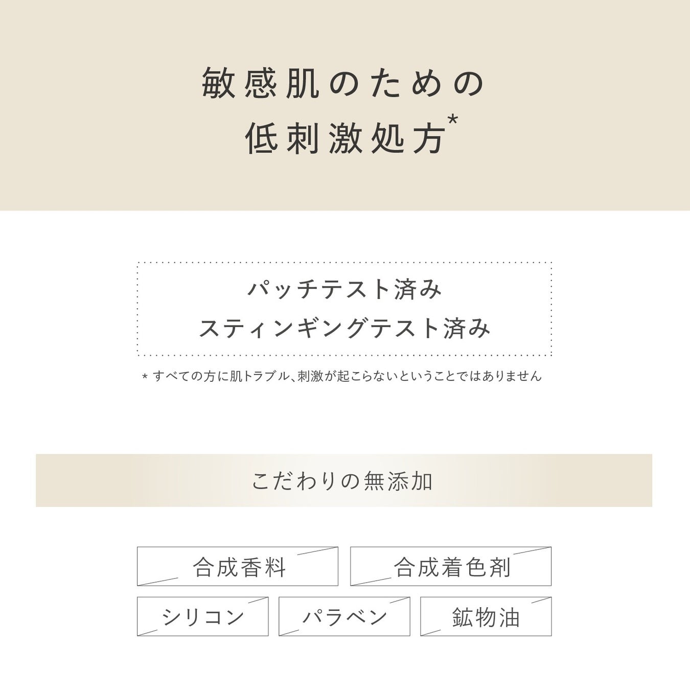 敏感肌のための低刺激処方*3 で、シリコン・合成香料・合成着色料・パラベン・鉱物油不使用。オンにもオフにも寄り添うフローラルウッディの香りにもこだわりました。