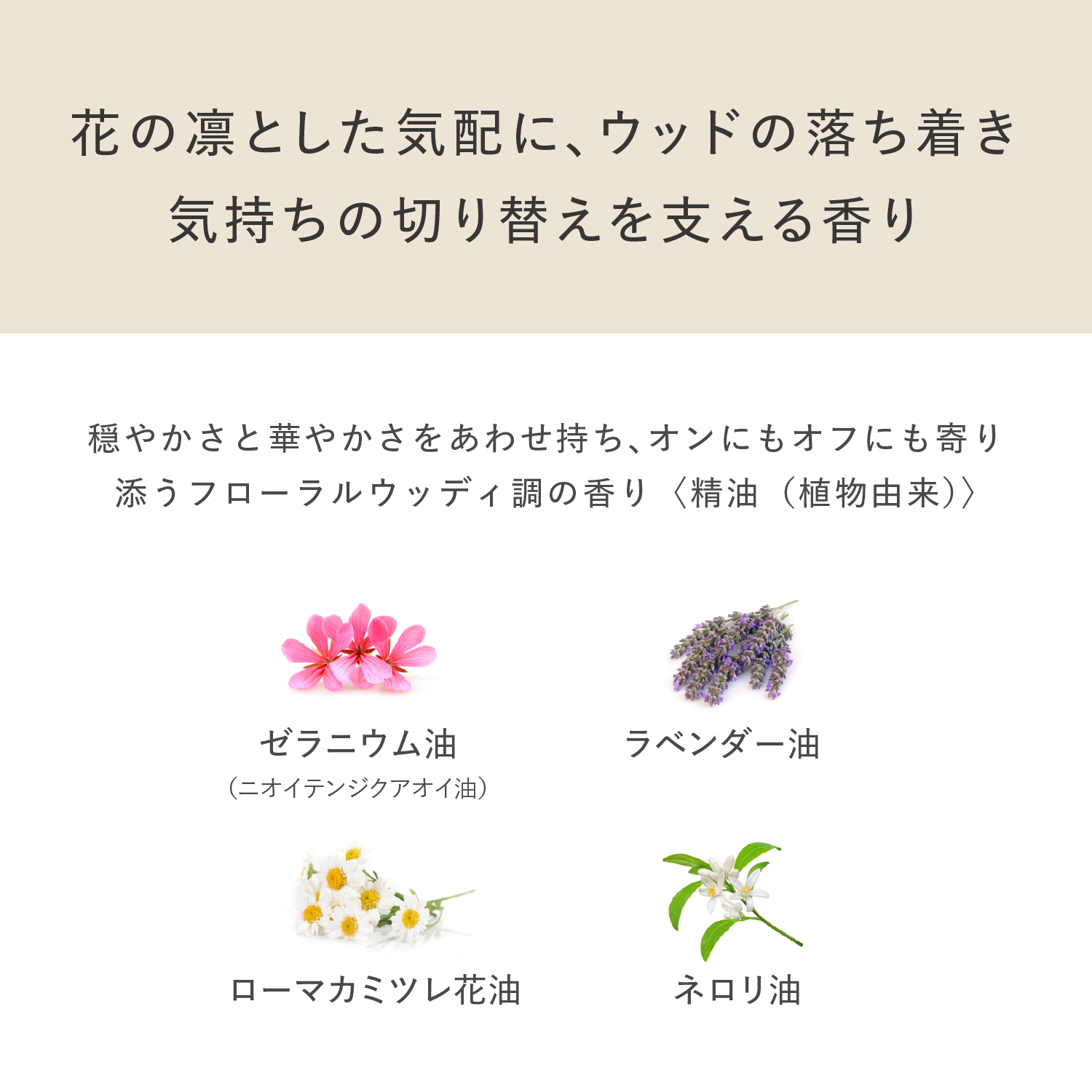 敏感肌のための低刺激処方*3 で、シリコン・合成香料・合成着色料・パラベン・鉱物油不使用。オンにもオフにも寄り添うフローラルウッディの香りにもこだわりました。