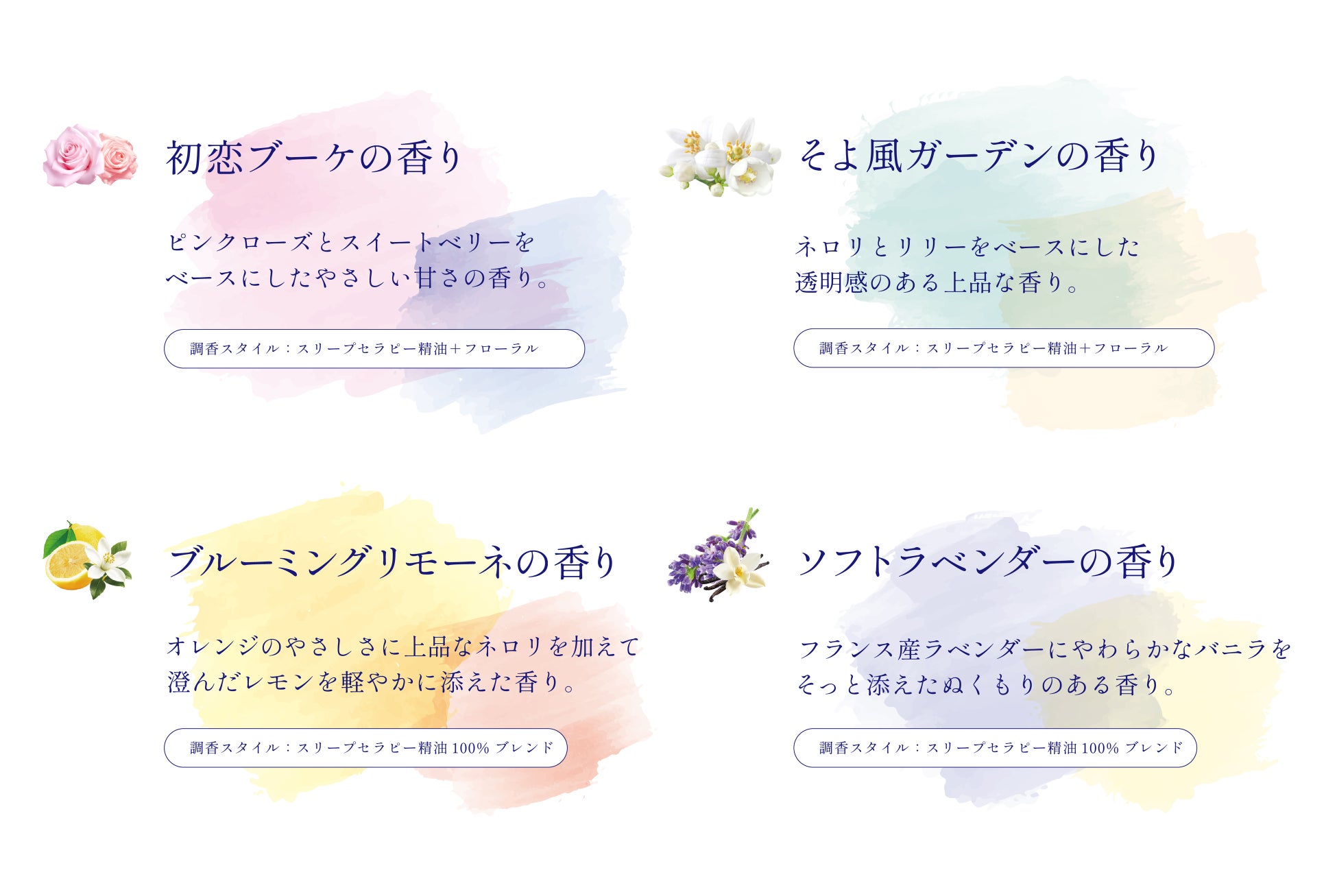 リラクゼーションにとどまらない香りの科学をベースに、4つの香りに発展させました。