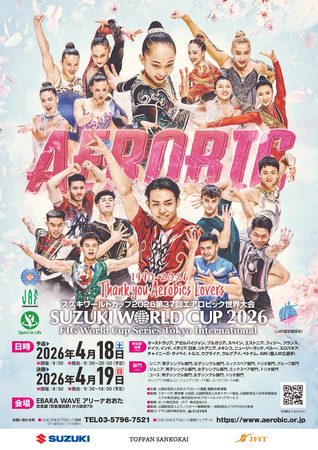 エアロビック競技世界一を決める「スズキワールドカップ2026 第37回エアロビック世界大会」[主催:(公社)日本エアロビック連盟、国際体操連盟]を、4月18日、19日の2日間、東京都大田区・ EBARA WAVE アリーナおおた(旧:大田区総合体育館)で開催します。