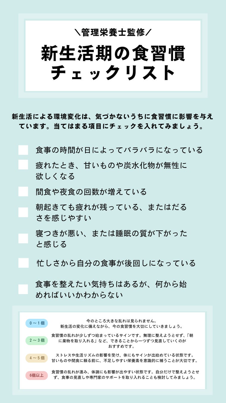 ーーこうした食習慣の乱れは、気づかないうちに進行していることも少なくありません。管理栄養士監修のチェックリストで、あなたの新生活期の食習慣を振り返ってみましょう。