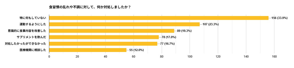 食習慣の乱れや体調の不調に対して、どのように向き合ったのかを尋ねたところ、「特に何もしていない(33.9%)」「対処したかったができなかった(16.7%)」を合わせ約半数が十分な対処ができていないことが明らかになりました。