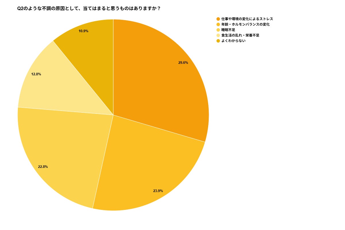 不調の背景として「仕事や環境の変化によるストレス(29.6%)」が最も多く挙げられた一方、「年齢・ホルモンバランスの変化(12.8%)」「よくわからない(10.9%)」を合わせると約23%が原因を特定できていない状況も明らかになりました。