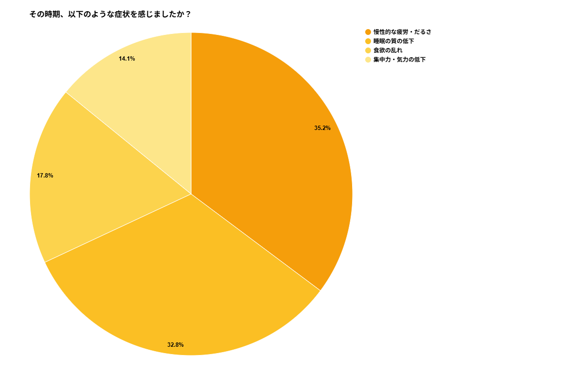 慢性的な疲労・だるさ(35.2%)、睡眠の質の低下(32.8%)が上位に。食習慣の乱れが体調にまで影響を及ぼしている実態が浮き彫りになりました。
