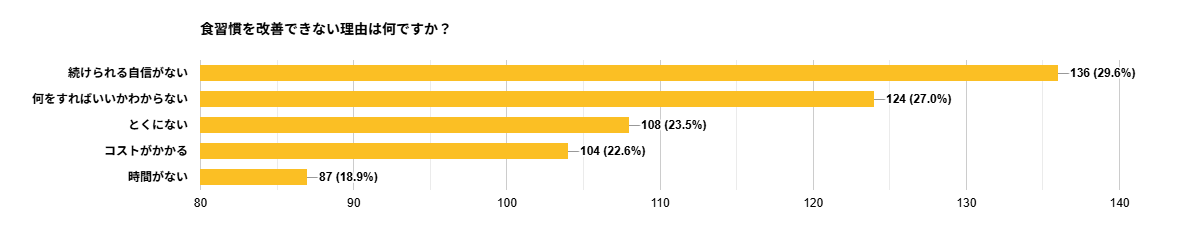 改善できない理由としては「続けられる自信がない(29.6%)」「何をすればいいかわからない(27.0%)」が上位を占め、約57%が方法や継続に課題を感じていることがわかりました。食習慣の改善に対する意欲はあるものの、具体的なアクションに踏み出せない女性が多く、実践につながるサポートが不足しているのではないかと考えられます。