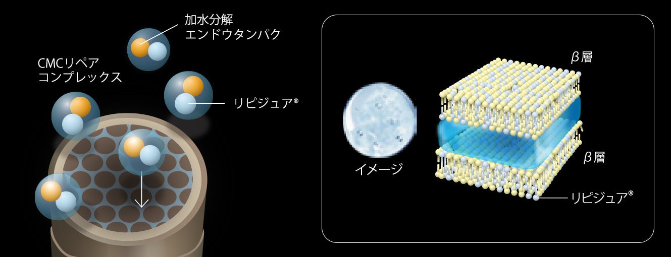 本リニューアルでは、リピジュア®【ポリクオタニウム-64(毛髪補修成分)】と加水分解エンドウタンパクを組み合わせた新開発のCMCリペアコンプレックスを配合。リピジュア®【ポリクオタニウム-64(毛髪補修成分)】は、毛髪内部のCMC(細胞間脂質)におけるβ層構造をサポートし、繊維内部のダメージを補修。さらに毛髪保護成分である加水分解エンドウタンパクとの相乗効果により、カラー施術中の毛髪コンディションを整えながら保護する「リペア効果」を発揮します。これにより、インパクトのあるクリエイティブカラー表現と、なめらかで艶のある仕上がりの両立を実現しました。