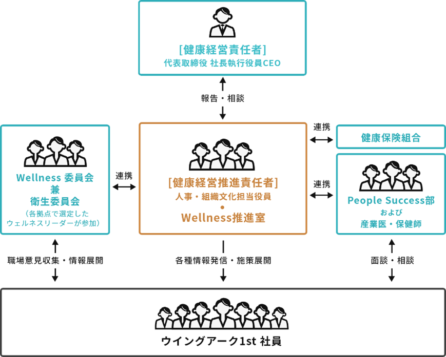 健康経営専属組織「Wellness推進室」を設置し、部署横断で選出されたWellness委員会で健康施策を企画・推進し、社員への浸透を図っています。