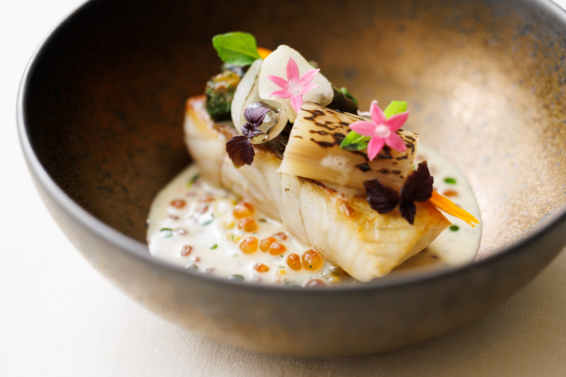 ディナーと朝食はメインダイニング「オランジュリー光庵」で。夜はやわらかく落ち着いた雰囲気、朝はたっぷりと自然光が降り注ぐ洗練の空間で、総料理長・加茂健による“心身にやさしい”料理が楽しめます。ディナーはフランス料理を体調や気分に合わせてコースやアラカルトで、朝食は和洋から選べるセットメニューとなります。