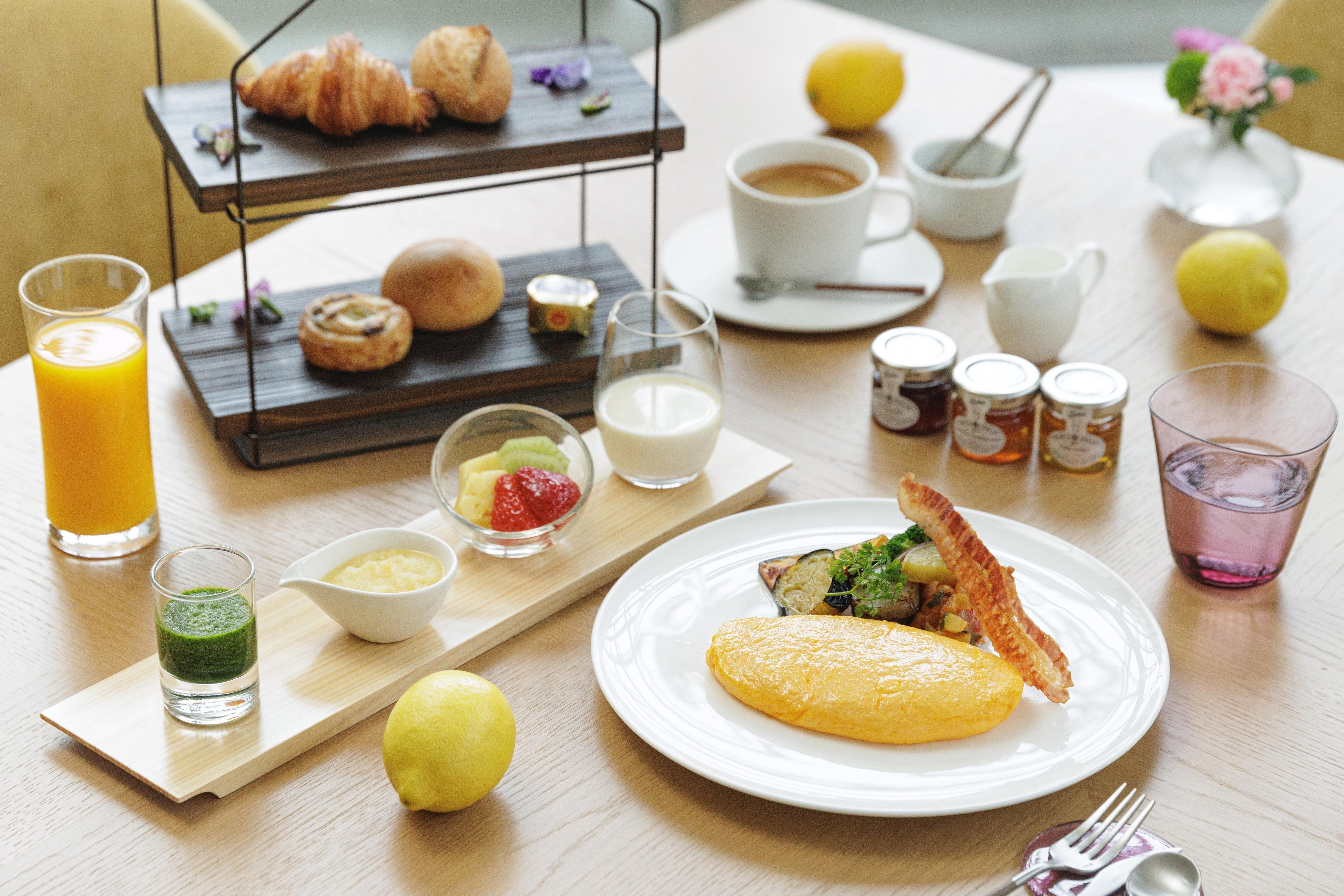 ディナーと朝食はメインダイニング「オランジュリー光庵」で。夜はやわらかく落ち着いた雰囲気、朝はたっぷりと自然光が降り注ぐ洗練の空間で、総料理長・加茂健による“心身にやさしい”料理が楽しめます。ディナーはフランス料理を体調や気分に合わせてコースやアラカルトで、朝食は和洋から選べるセットメニューとなります。