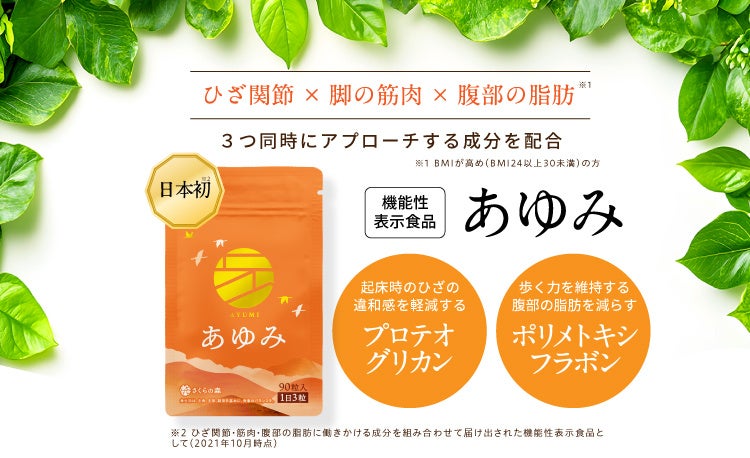 ※あゆみにはブラックジンジャー由来ポリメトキシフラボン及びサケ鼻軟骨由来プロテオグリカンが含まれます。ブラックジンジャー由来ポリメトキシフラボンは、年齢とともに低下する脚の筋力に作用することにより、中高年の方の歩く力を維持することが報告されています。ブラックジンジャー由来ポリメトキシフラボンは、日常活動時のエネルギー代謝において脂肪を消費しやすくする作用により、BMIが高め(BMI24以上30未満)の方の腹部の脂肪(内臓脂肪及び皮下脂肪)を減らす機能があることが報告されています。サケ鼻軟骨由来プロテオグリカンには、膝関節の不快感を持つ方の軟骨成分の分解を抑え、関節軟骨の保護に役立ち、膝関節の可動性、日常生活における膝の動き(階段の上り下り、歩く、立ち上がる、落ちたものを拾う、座っている)の改善に役立ち、起床時の膝の違和感を軽減することが報告されています。