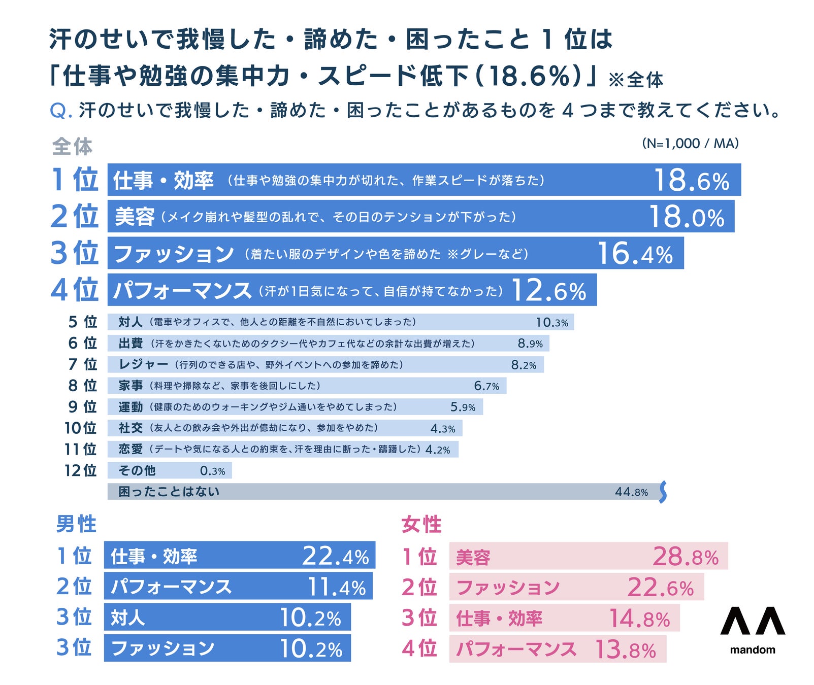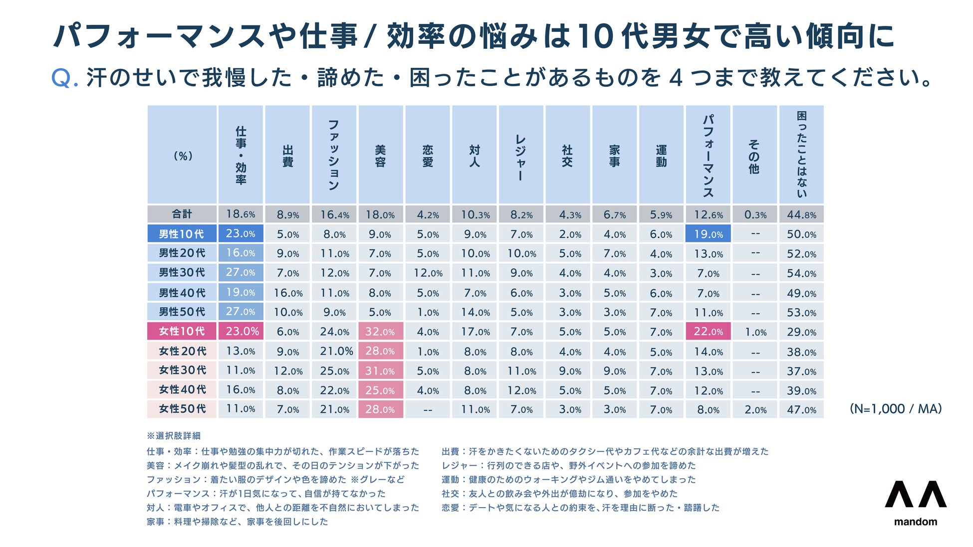 株式会社マンダムは、生活者の汗に関連するお悩みの解消をサポートするため、10〜50代の男女1,000名を対象に「汗とにおいに関する意識調査」を実施しました。