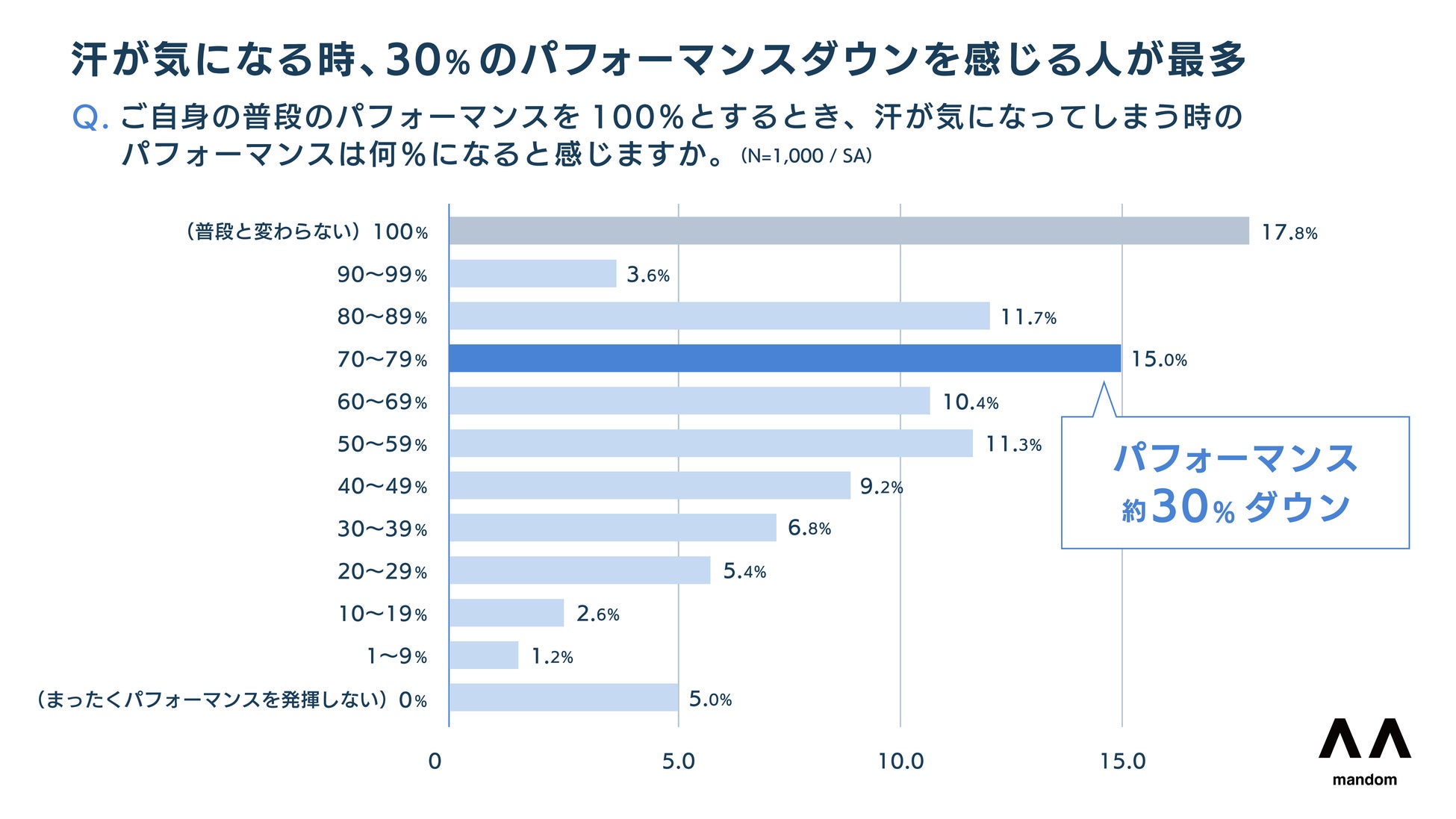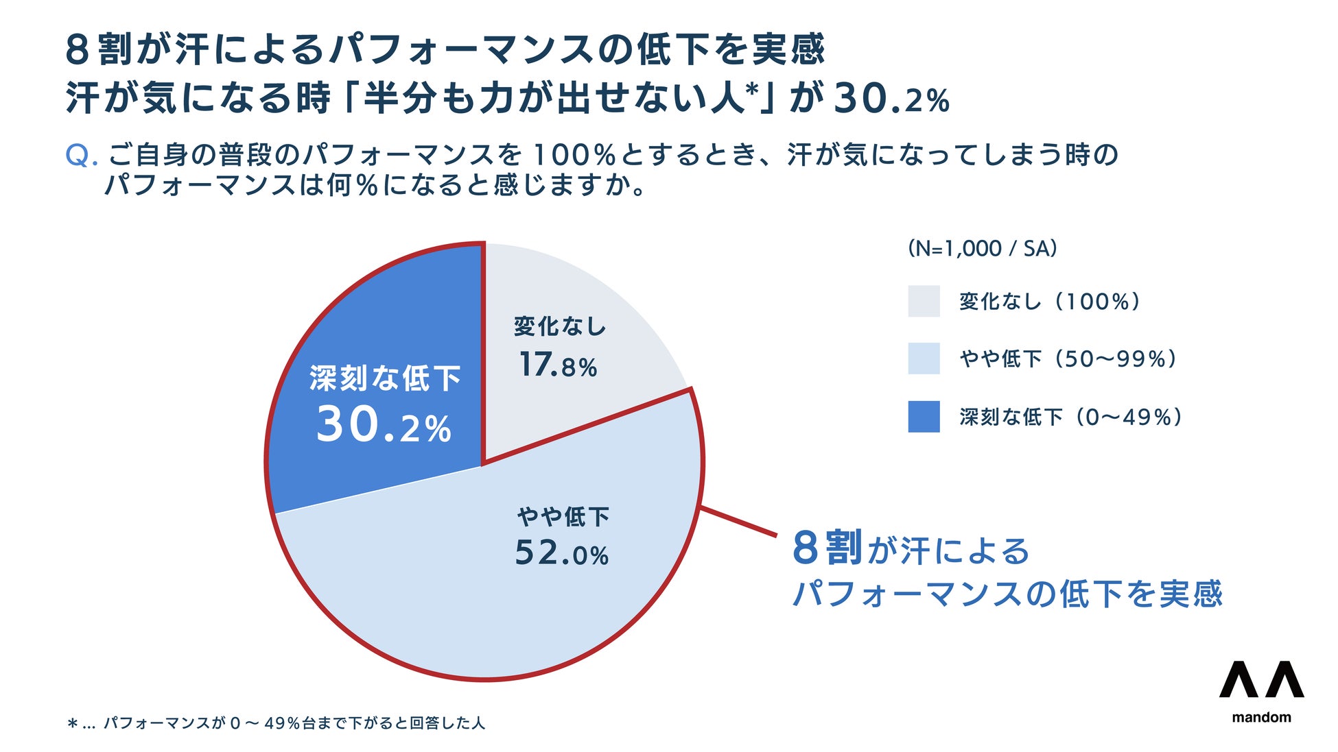 8割以上が汗によるパフォーマンスの低下を実感。パフォーマンス3割ダウンが最多。