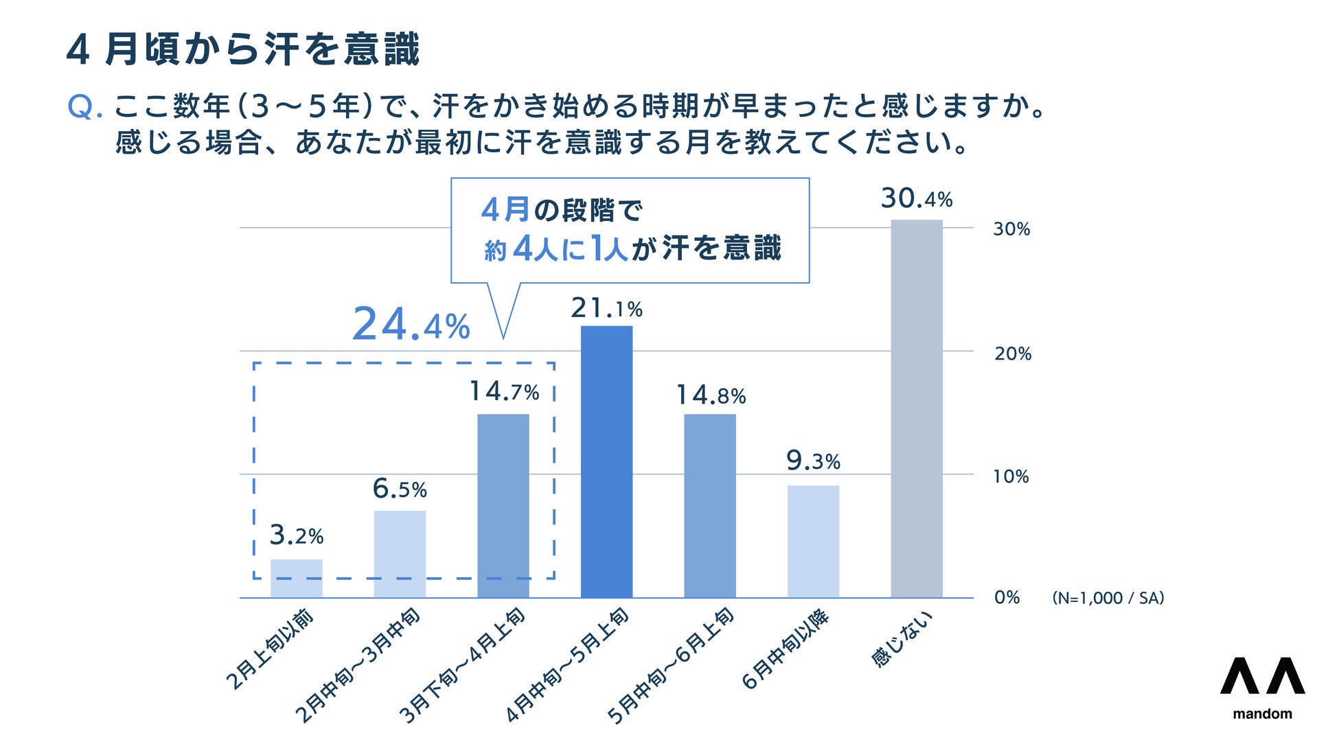 1.約7割が汗をかき始める時期が早まったと実感。「4月」の段階で既に約4人に1人が汗を意識。