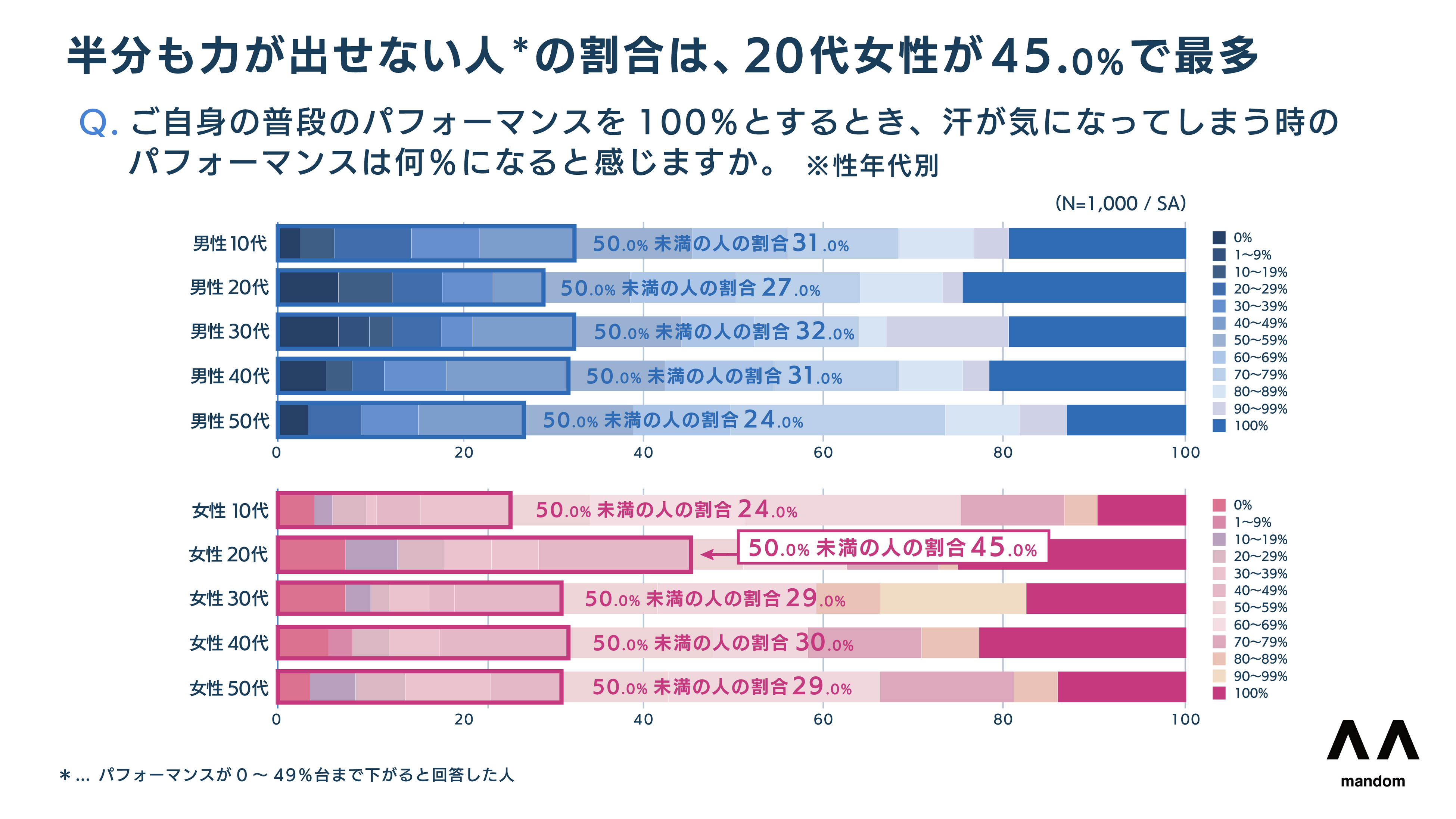 また、「本来の半分も力が出せない(パフォーマンス50%未満)」と感じている層は全体で30.2%で、特に20代女性においては45.0%と約半数に上る結果となりました。