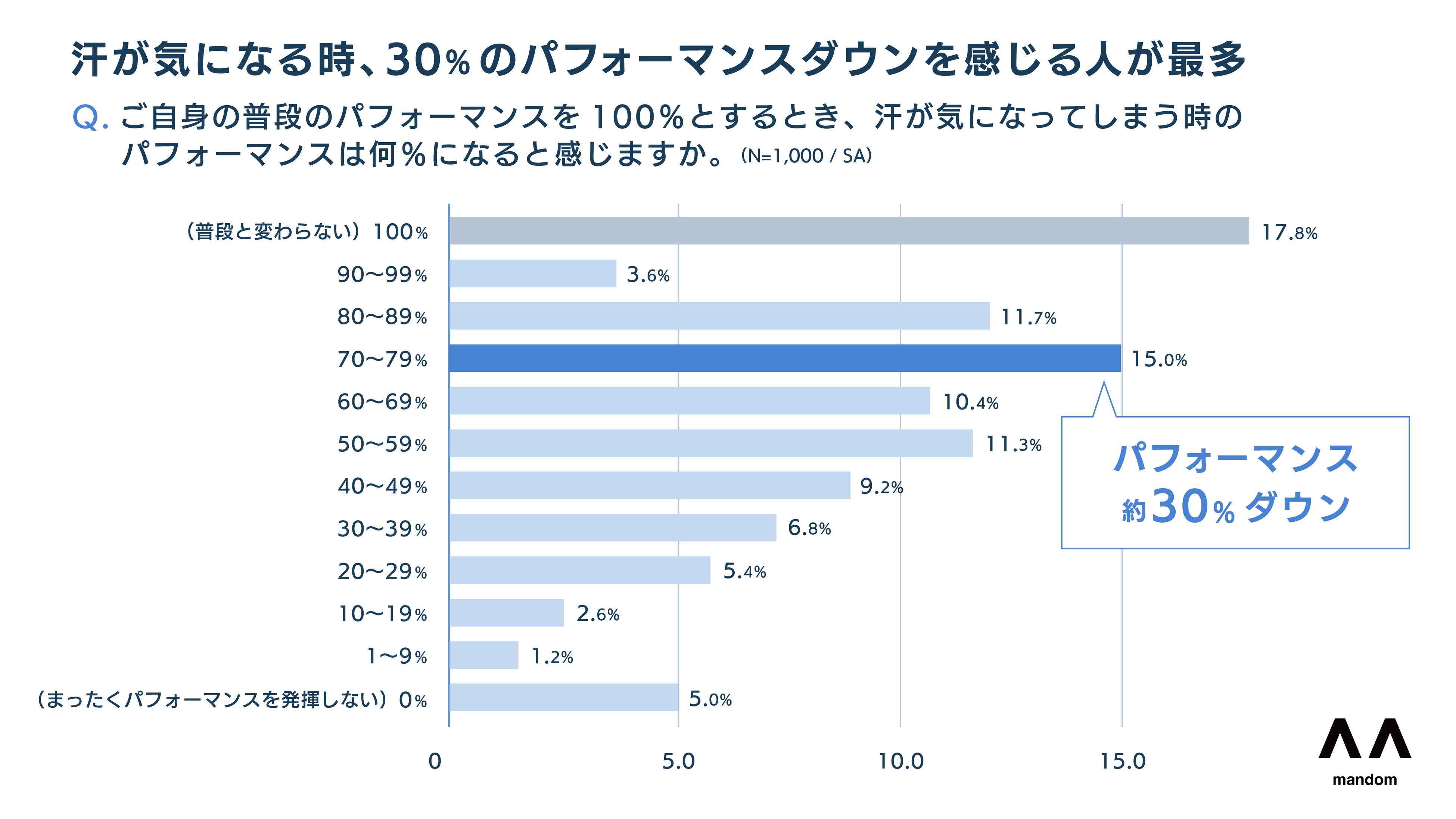 8割以上が汗によるパフォーマンスの低下を実感。パフォーマンス3割ダウンが最多。