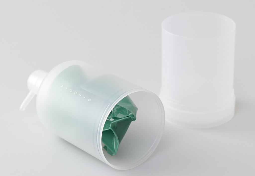 500mL用のカートリッジ式エコボトル。詰め替え用のリフィルを最後の一滴まで使えて、プラを約90%削減できる。