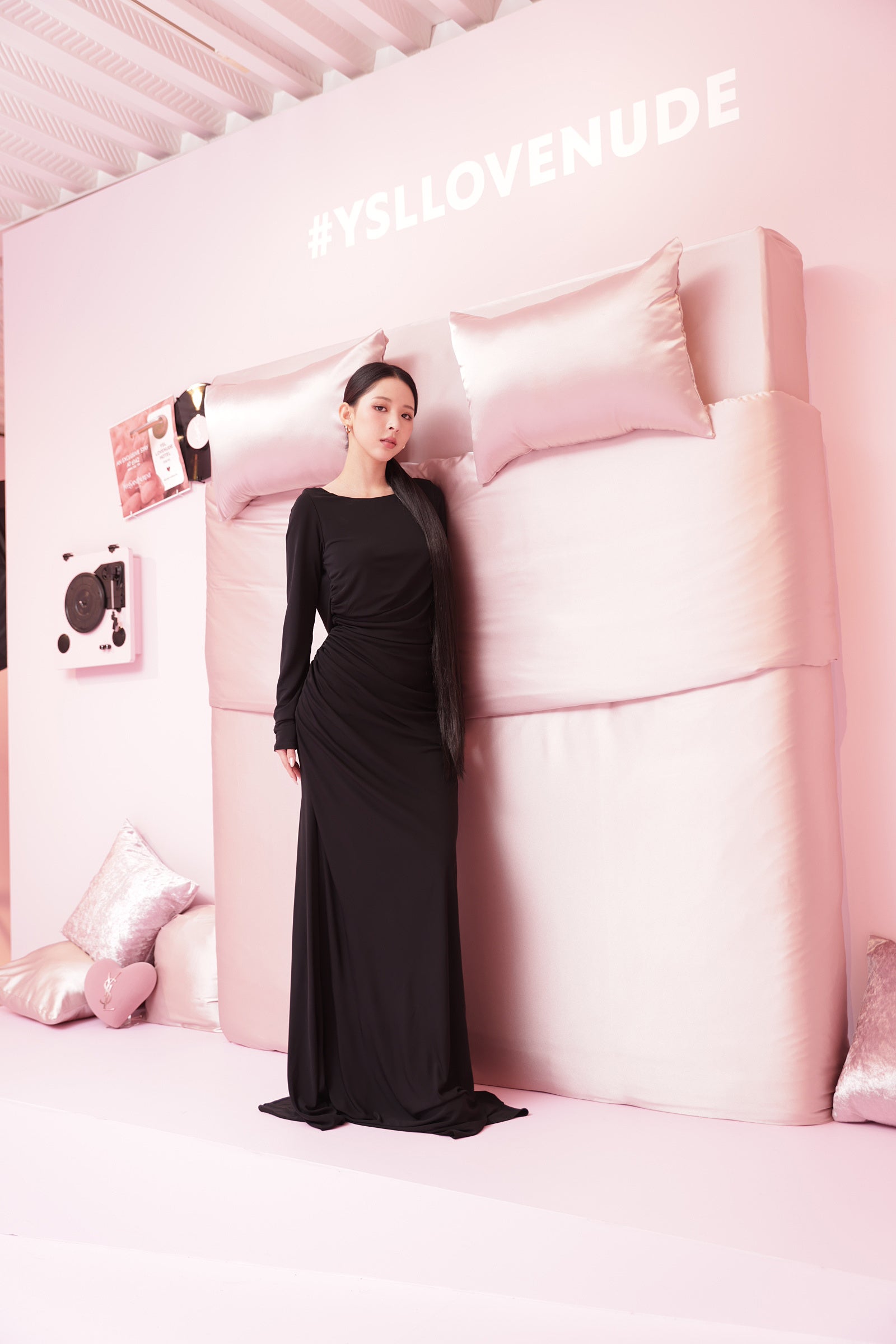 「YSL LOVENUDE」のセンシュアルなピンクヌードカラーに包まれた“YSL LOVENUDE HOTEL TOKYO”は、1FがDJブースも設置した『RECEPTION』フロア、2Fは、「YSL ラブヌード リップスティック」の“ふわじゅわ”体験を各ブースでお楽しみいただける『LOBBY GAME』フロア、3Fは、「YSL ラブヌード リップスティック」を始めとする、YSLのアイコンリップやフレグランスをご自由にお試しいただける『GUEST ROOM』フロアで構成された、YSLだけの特別なフォトジェニックなホテルです。