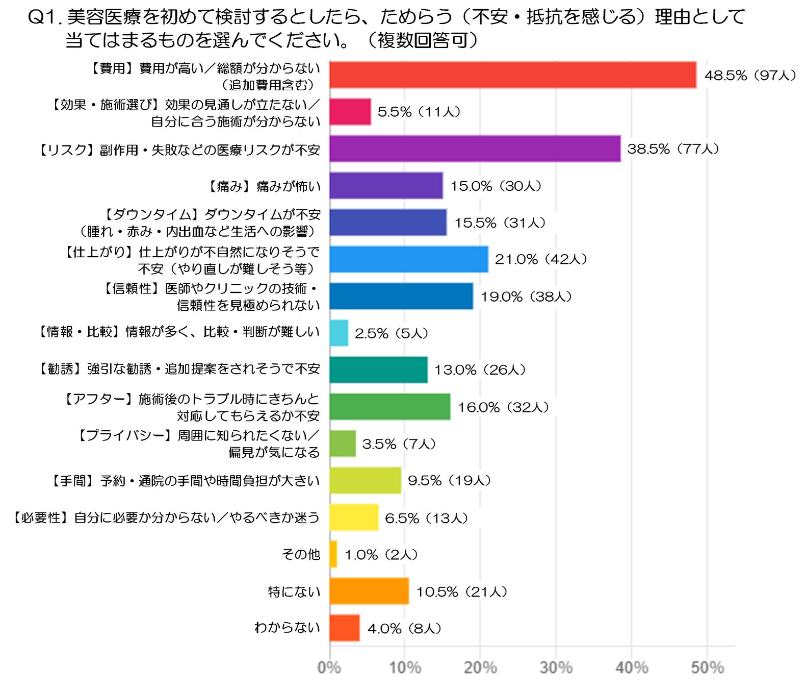 Q1.美容医療を初めて検討するとしたら、ためらう(不安・抵抗を感じる)理由として当てはまるものを選んでください。(複数選択可:注1)